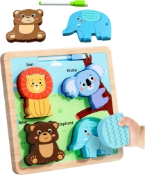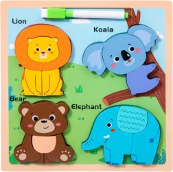 Το ξύλινο εκπαιδευτικό παζλ με θέμα άγρια ζώα είναι ένα πολυχρηστικό παιχνίδι που αναπτύσσει τις χειρωνακτικές και γνωστικές δεξιότητες του παιδιού. Αυτό το παζλ περιλαμβάνει τέσσερις πολύχρωμες φιγούρες άγριων ζώων: λιοντάρι, κοάλα, αρκούδα και ελέφαντα, που μπορούν να τοποθετηθούν στις σωστές θέσεις.