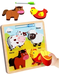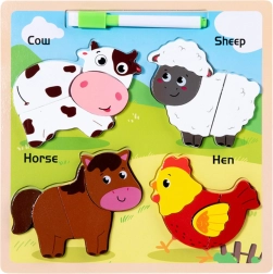 Αυτό το ξύλινο εκπαιδευτικό παζλ περιλαμβάνει ζώα όπως αγελάδα, πρόβατο, άλογο και κότα, γνωστά στα παιδιά. Κάθε ζωάκι αποτελείται από αρκετά κομμάτια που πρέπει να τοποθετηθούν στη σωστή θέση, κάτι που ενισχύει τον συντονισμό κινήσεων και τη λογική σκέψη.