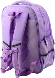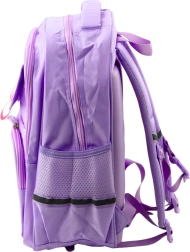 Η μωβ σχολική μας τσάντα προσφέρει δύο ευρύχωρες κύριες θήκες. Η κύρια θήκη διαθέτει εσωτερικό χωρίσμα για εύκολη οργάνωση βιβλίων και σχολικών ειδών. Στο μπροστινό μέρος υπάρχουν δύο επιπλέον τσέπες και στα πλαϊνά ελαστικές θήκες για μπουκάλι.