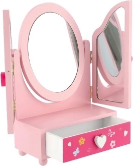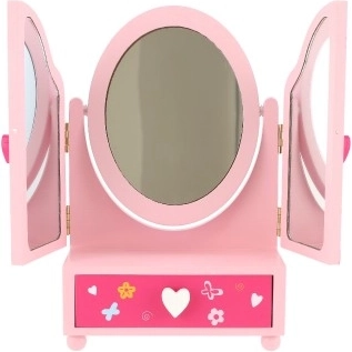 Ένας χαριτωμένος παιδικός καθρέφτης τουαλέτας με κοσμηματοθήκη στο μοτίβο PRINCESS θα ενθουσιάσει κάθε μικρή κοκέτα. Τρίπτυχος καθρέφτης με πλαϊνά τμήματα για καλύτερη ορατότητα, πρακτικό συρτάρι για θησαυρούς και στιβαρή ξύλινη κατασκευή σε απαλό ροζ χρώμα. Ιδανικό για αποθήκευση δαχτυλιδιών, βραχιολιών και χαντρών και για ενίσχυση της δημιουργικής παιχνιδιού.
