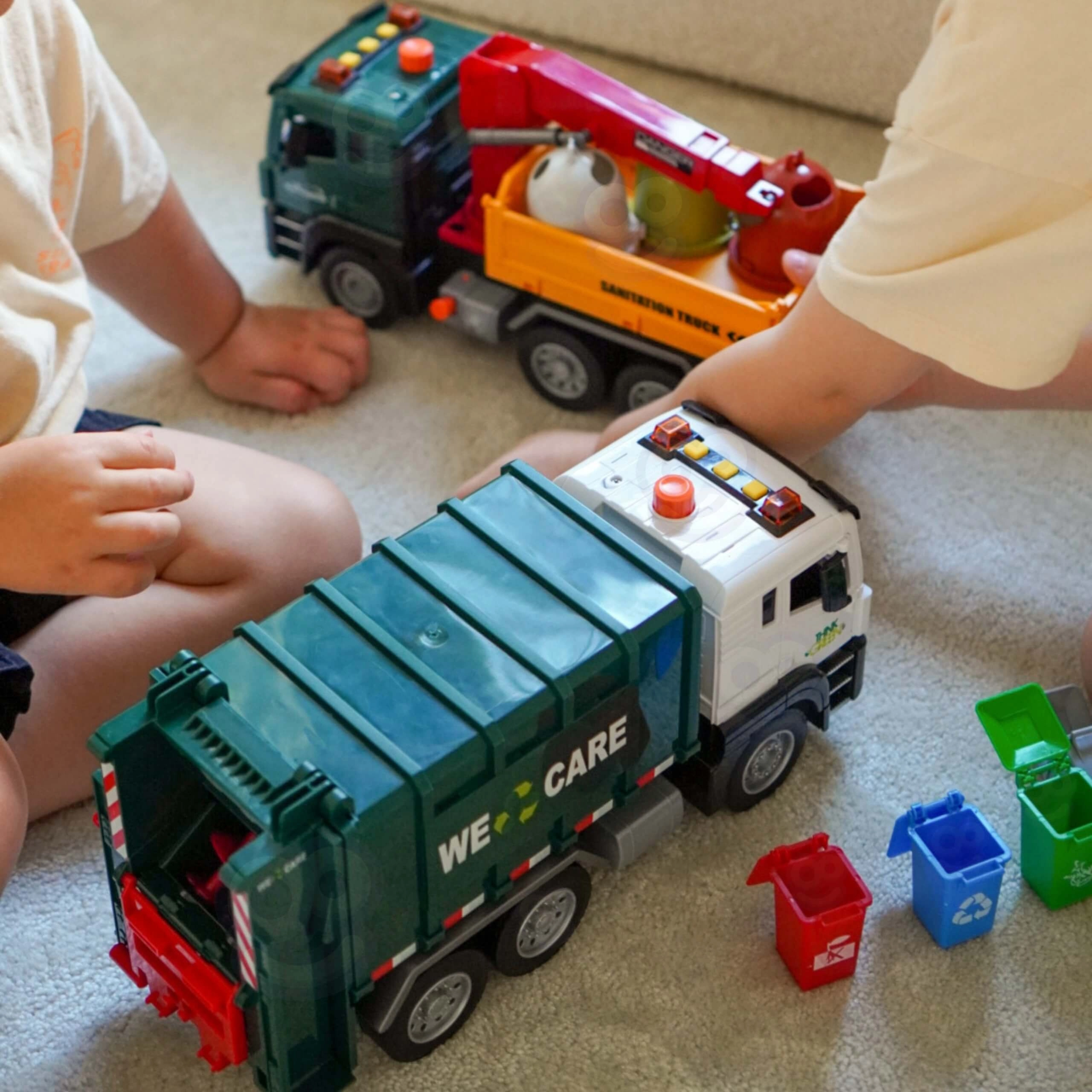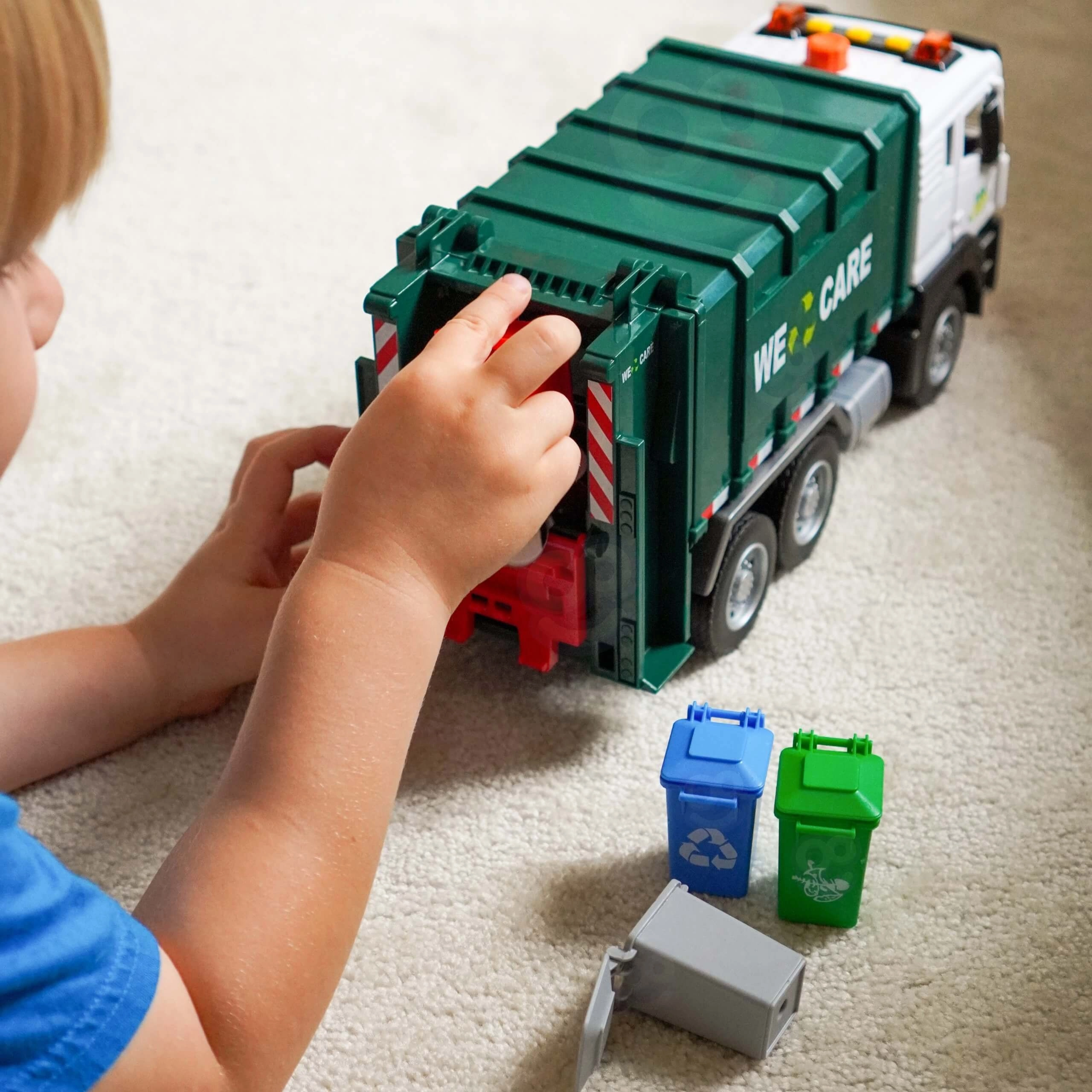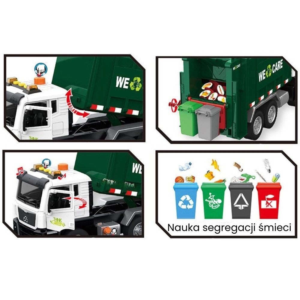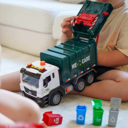 Το διαδραστικό απορριμματοφόρο κλίμακας 1:10 εντυπωσιάζει με ρεαλιστική κατασκευή, φωτεινά και ηχητικά εφέ, λειτουργική ανύψωση κάδων και ανοιγόμενη πίσω θυρίδα. Περιλαμβάνει 4 έγχρωμους κάδους και εικονικές καρτέλες για παιχνίδι και εκμάθηση διαλογής απορριμμάτων, αναπτύσσοντας δημιουργικότητα, φαντασία και λογική σκέψη για παιδιά από 3 ετών.