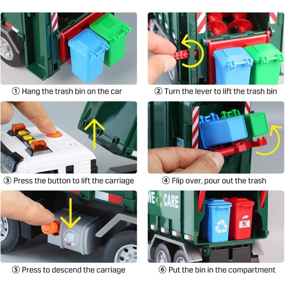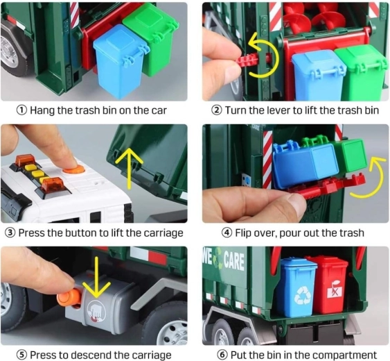 Το όχημα διαθέτει φώτα και ήχους για ακόμη μεγαλύτερη εμβύθιση. Στη συσκευασία θα βρείτε 4 έγχρωμους κάδους και σετ καρτελών με απορρίμματα που βοηθούν τα παιδιά να κατανοήσουν τι ανήκει πού. Κατάλληλο για καθημερινό παιχνίδι στο σπίτι και στο νηπιαγωγείο.