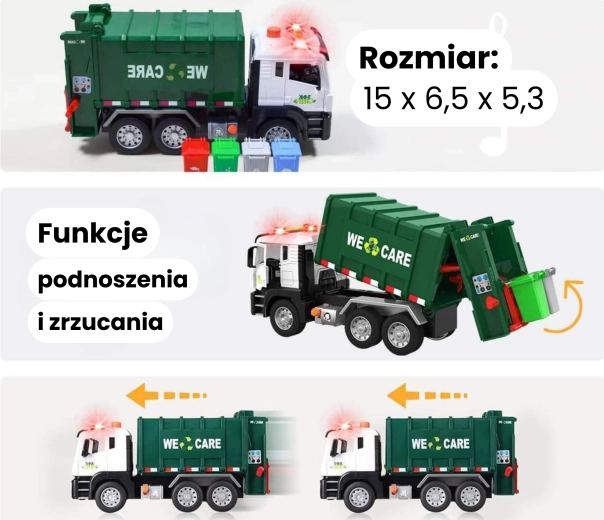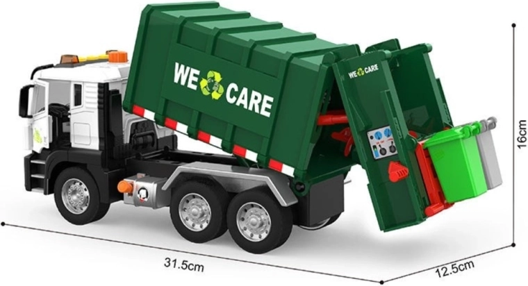 Αυτό το λεπτομερές απορριμματοφόρο με την επιγραφή «We Care» προσφέρει στα παιδιά αυθεντική εμπειρία αστικής κυκλοφορίας. Το λειτουργικό βραχίονα ανύψωσης κάδων, ο ανοιγόμενος πίσω χώρος φόρτωσης και η ανθεκτική κατασκευή υποστηρίζουν ρεαλιστικό παιχνίδι και εκμάθηση οικολογικών συνηθειών.