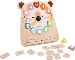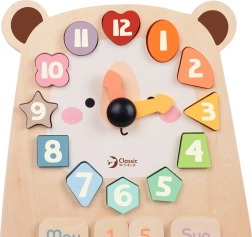 Το ξύλινο ρολόι σε σχήμα αρκουδιού από τη μάρκα Classic World είναι ένα πολυχρηστικό παιχνίδι που βοηθά τα παιδιά να μάθουν την ώρα, τις ημέρες της εβδομάδας, τους μήνες και να αναγνωρίζουν χρώματα και σχήματα. Χάρη στα αποσπώμενα τουβλάκια με αριθμούς και ονομασίες, οι μικροί μπορούν να εξασκηθούν στον συντονισμό χεριού‑ματιού, τη λογική σκέψη και τις χειρωνακτικές δεξιότητες.
