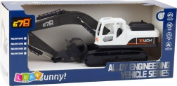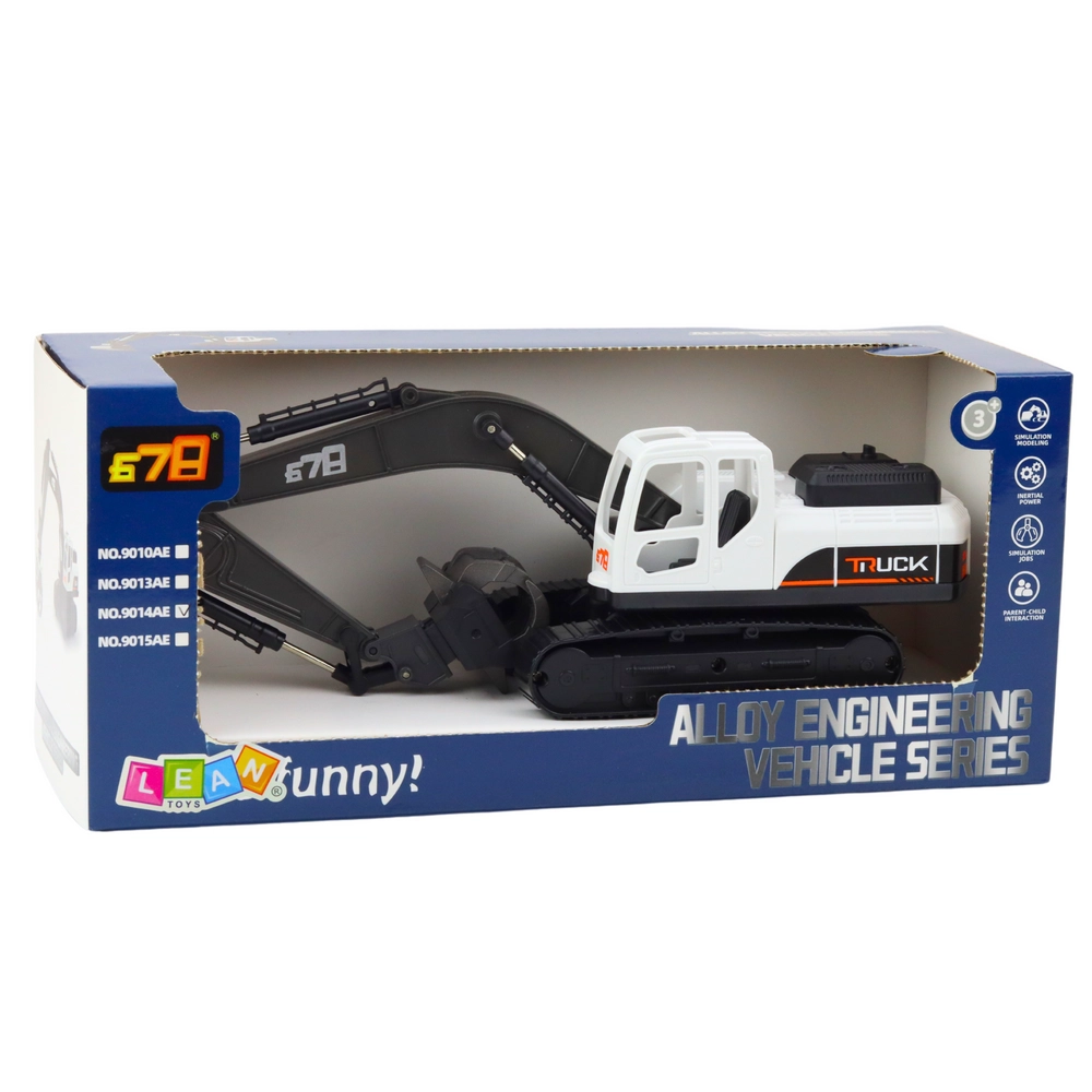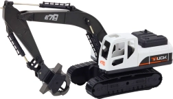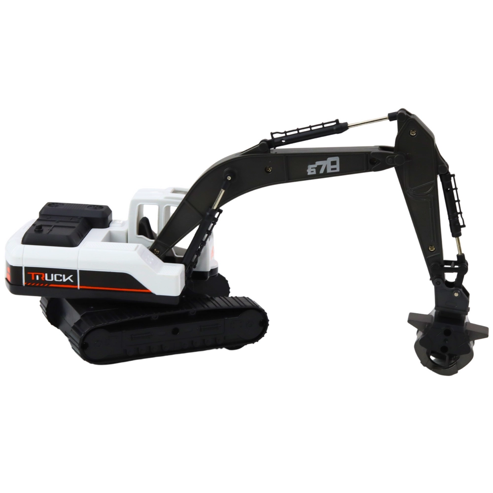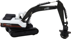 Ο ερπυστριοφόρος εκσκαφέας είναι εξοπλισμένος με δαγκάνα αντί για παραδοσιακό κουβά, διαθέτει αρθρωτό βραχίονα με πολλά σημεία κίνησης και περιστροφή 360° της βάσης. Το σασί με ερπύστριες εξασφαλίζει σταθερότητα και στιβαρή εμφάνιση όπως στα πραγματικά μηχανήματα έργων. Το μοντέλο σε μοντέρνο ασπρόμαυρο-γκρι συνδυασμό χρωμάτων ταιριάζει ιδανικά σε κάθε συλλογή παιχνιδιών κατασκευών.