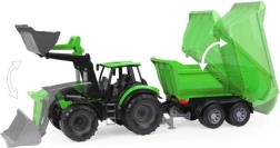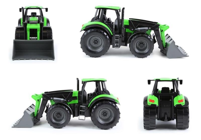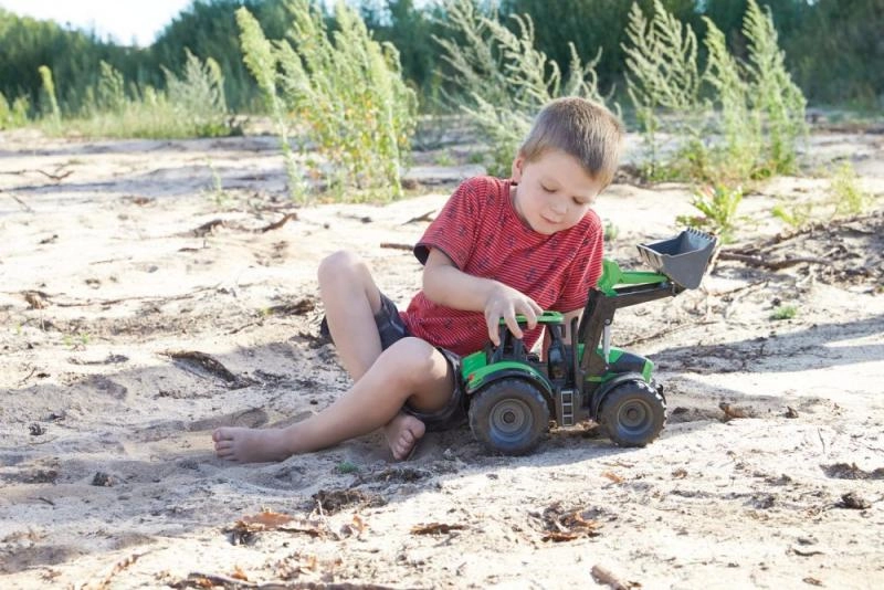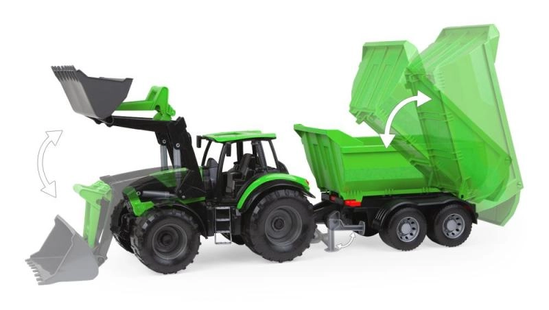 Αυτό το λεπτομερώς κατασκευασμένο τρακτέρ με ρυμουλκούμενο είναι ιδανικό για παιχνίδι στο σSandbox, στον κήπο ή στο σπίτι. Ο λειτουργικός μετωπικός φορτωτής επιτρέπει εύκολη συλλογή άμμου ή μικρών υλικών, ενώ το ρυμουλκούμενο με ανατρεπόμενη καρότσα εξασφαλίζει άνετη μεταφορά και εκφόρτωση φορτίου. Οι μεγάλοι, προφίλ τροχοί και οι μεταλλικοί άξονες τροχών 6 mm προσφέρουν σταθερότητα και αντοχή ακόμη και σε έντονο παιχνίδι.