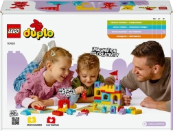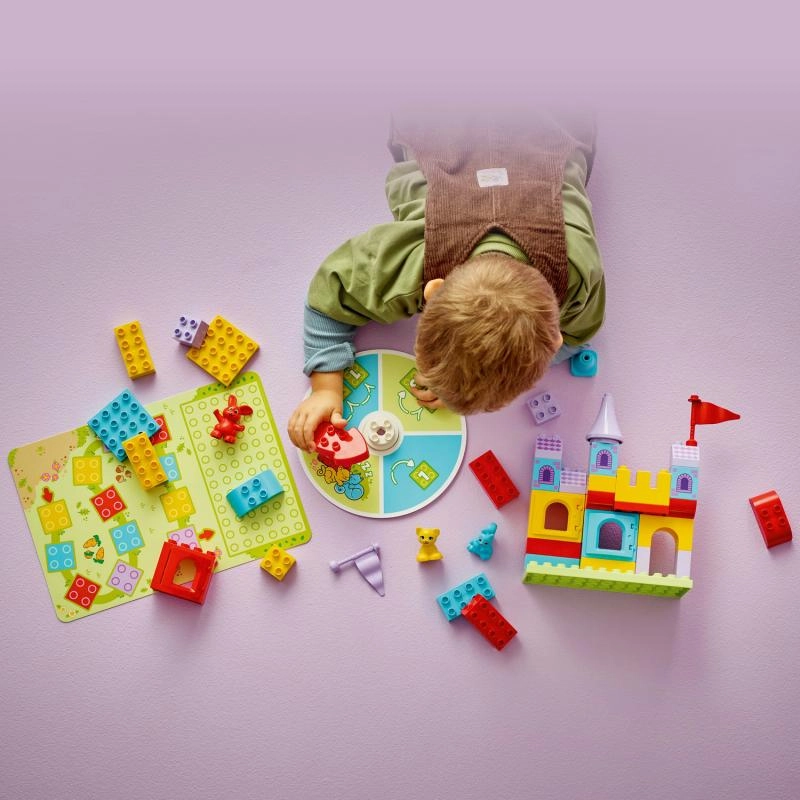 Αυτό το έξυπνο παιχνίδι και σετ κατασκευής LEGO DUPLO 2 σε 1 προσφέρει στα παιδιά διασκεδαστική μάθηση μέσω του παιχνιδιού. Χτίστε μαζί ένα πολύχρωμο κάστρο, γυρίστε τον δείκτη και μετακινήστε τις φιγούρες των ζώων στο ταμπλό. Ανάλογα με το χρώμα στο οποίο θα σταματήσετε, προσθέστε στο κάστρο το σωστό κομμάτι – κερδίζει το ομαδικό πνεύμα όταν όλοι οι χαρακτήρες φτάσουν στο κάστρο!