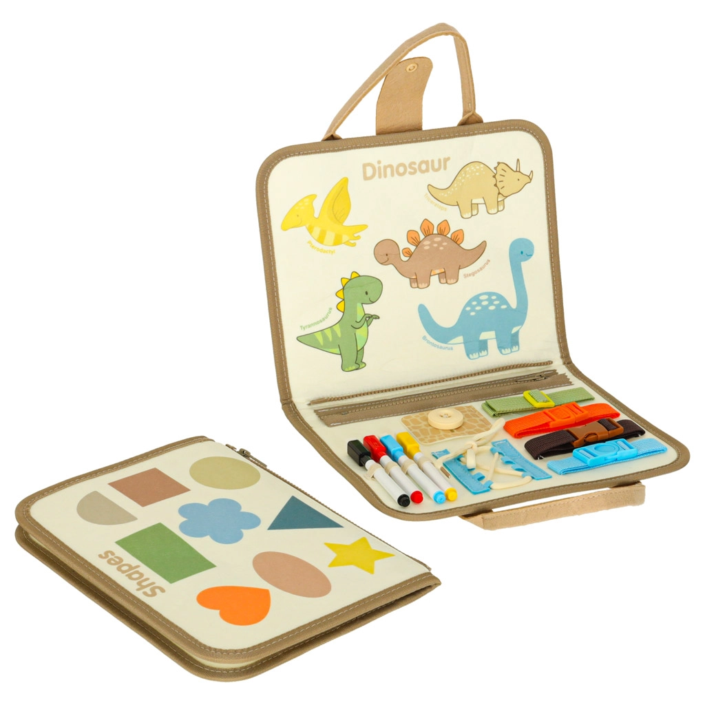 Η Μοντεσόρι αισθητηριακή βαλίτσα με δεινόσαυρους συνδυάζει τη χαρά της ανακάλυψης με τη μάθηση. Με αγκράφες, φερμουάρ, κουμπιά και άλλα στοιχεία, τα παιδιά μπορούν να εξασκούν τις δεξιότητές τους με διασκεδαστικό τρόπο. Αυτή η συμπαγής και οπτικά ελκυστική βαλίτσα είναι ιδανική για χρήση στο σπίτι ή στο ταξίδι.
