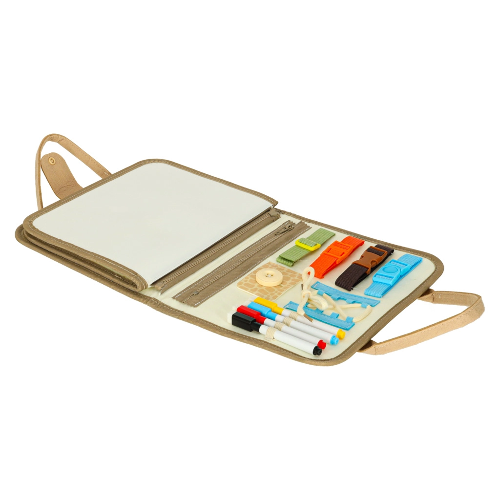 Η βαλίτσα είναι εξοπλισμένη με μια σειρά από στοιχεία για πρακτική μάθηση. Επιτρέπει στα παιδιά να εξασκούν το κούμπωμα κουμπιών, το κλείσιμο φερμουάρ και άλλες διασκεδαστικές δραστηριότητες που υποστηρίζουν τις κινητικές δεξιότητες.