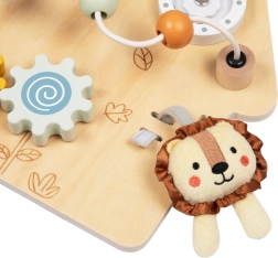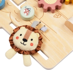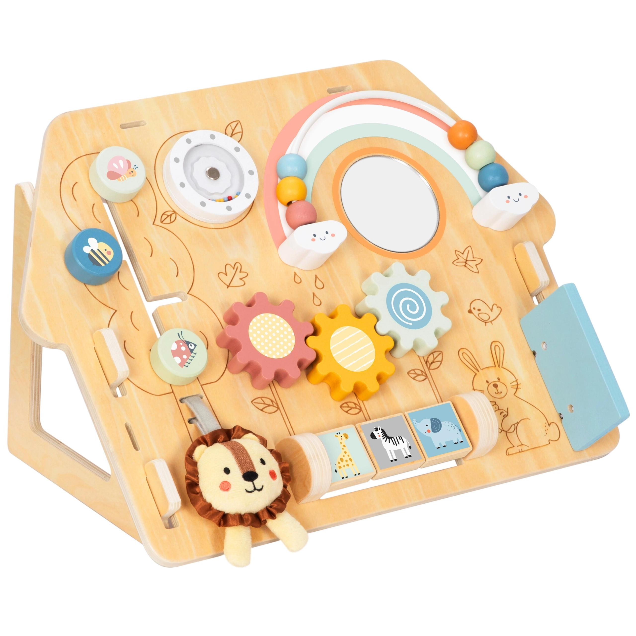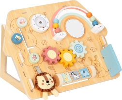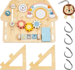 Ο ξύλινος πίνακας δραστηριοτήτων σε σχήμα σπιτιού προσφέρει σε παιδιά από 1 έτους ώρες ανακάλυψης και παιχνιδιού. Υποστηρίζει τη λεπτή κινητικότητα, την αισθητηριακή ανάπτυξη και τον συντονισμό χεριού–ματιού χάρη στην ποικιλία δραστηριοτήτων: οδοντωτοί τροχοί, συρόμενα στοιχεία, καθρεφτάκι, χάντρες σε ουράνιο τόξο και περιστρεφόμενοι κύλινδροι. Κατασκευασμένος από ποιοτικό ξύλο και σχεδιασμένος ώστε να είναι ασφαλής για τους μικρότερους.
