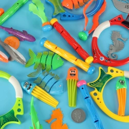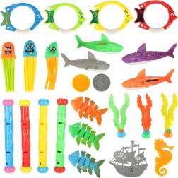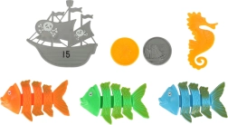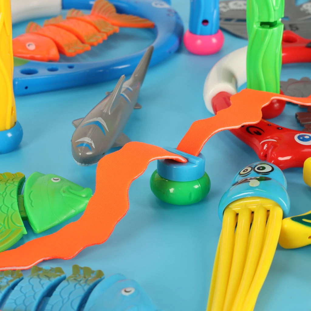 Κάτω από το νερό τα παιδιά μπορούν να συναντήσουν ψάρια, ιππόκαμπους και χταπόδια, που θα τα βοηθήσουν να αναπτύξουν τις δεξιότητες και τη λεπτή κινητικότητά τους. Στο σετ περιλαμβάνονται επίσης σωληνάκια κατάδυσης, που επιτρέπουν στα παιδιά να ανασύρουν εύκολα τα παιχνίδια από το νερό. Το σετ είναι κατάλληλο όχι μόνο για καθημερινό παιχνίδι, αλλά και για αισθητηριακή ολοκλήρωση και ανάπτυξη λεπτής κινητικότητας.