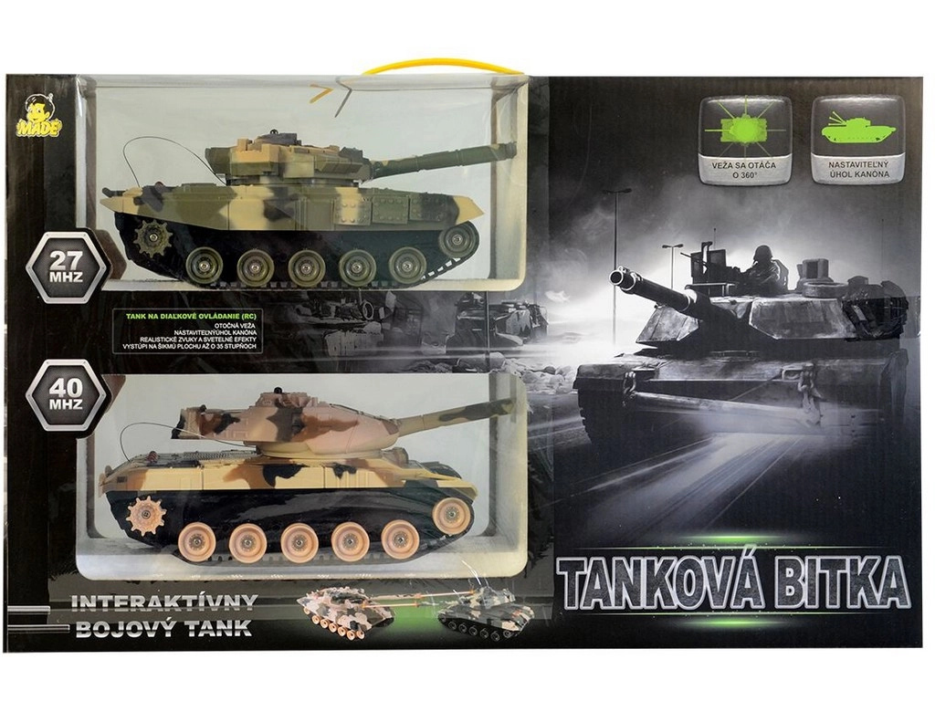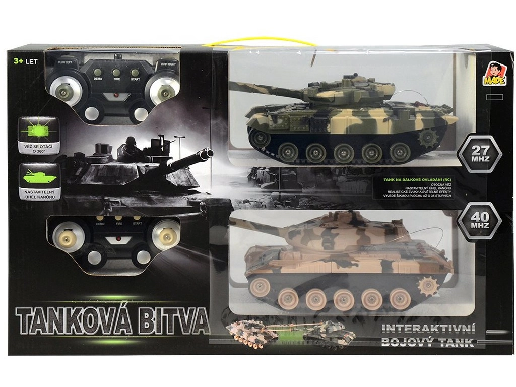 Αυτό το σετ τανκ προσφέρει πλούσια διαδραστική διασκέδαση με ρεαλιστικές λειτουργίες μάχης. Η συχνότητα 27/40 MHz εξασφαλίζει αξιόπιστο έλεγχο έως και 15 m. Κάθε τανκ είναι εξοπλισμένο με κάννες με υπέρυθρες διόδους για καταγραφή επιτυχιών. Τα χειριστήρια διαθέτουν σκανδάλη που προσφέρει αυθεντική εμπειρία μάχης. Όταν ένα τανκ δεχθεί πλήγμα, ακούγεται ήχος έκρηξης και οι διόδοι στον πύργο αφαιρούν «ζωές».