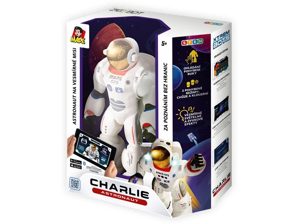 Με την εκπαιδευτική εφαρμογή μπορείτε να προγραμματίσετε έως και 200 κινήσεις και να απολαύσετε δυνατότητες όπως η Κοσμοπαιδεία ή το διασκεδαστικό Κόσμο-κουίζ, που δοκιμάζει τις γνώσεις σας για το διάστημα. Ο Charlie είναι επίσης εξοπλισμένος με φωτεινά και ηχητικά εφέ, που ενισχύουν τον ρεαλιστικό του χαρακτήρα. Κατασκευασμένος από ανθεκτικό πλαστικό και τροφοδοτούμενος από τρεις μπαταρίες 1,5V AA, είναι έτοιμος για κάθε διαστημική περιπέτεια. Ελληνικός σχεδιασμός κουτιού και πολυγλωσσική εφαρμογή, συμπεριλαμβανομένων ελληνικών, εξασφαλίζουν ότι το ρομπότ είναι μια εξαιρετική επιλογή για όσους θέλουν να διασκεδάσουν και να μάθουν ταυτόχρονα!