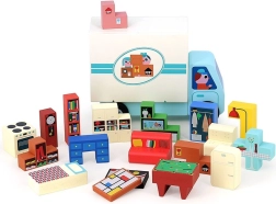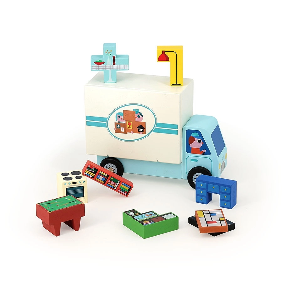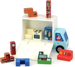 Το σετ περιλαμβάνει ξύλινο φορτηγό μετακόμισης και 19 κομμάτια σε μορφή επίπλων, ιδανικά για ατομικό παιχνίδι ή παιχνίδι με την οικογένεια.
