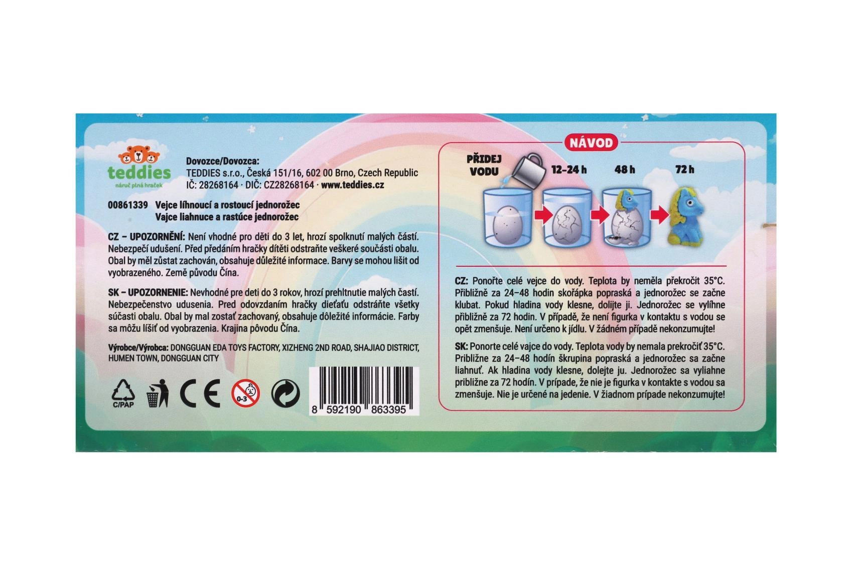 Απλώς βυθίστε το αβγό σε δοχείο με νερό και μέσα σε λίγες ώρες θα αρχίσει να σκάει – στο εσωτερικό του εμφανίζεται ένας μικρός μονόκερος. Σταδιακά θα μεγαλώνει για μερικές ημέρες, μέχρι να φτάσει στο πλήρες μέγεθός του. Αυτό το μαγικό παιχνίδι αναπτύσσει την παιδική περιέργεια, την υπομονή και προσφέρει χαρά από την ανακάλυψη.