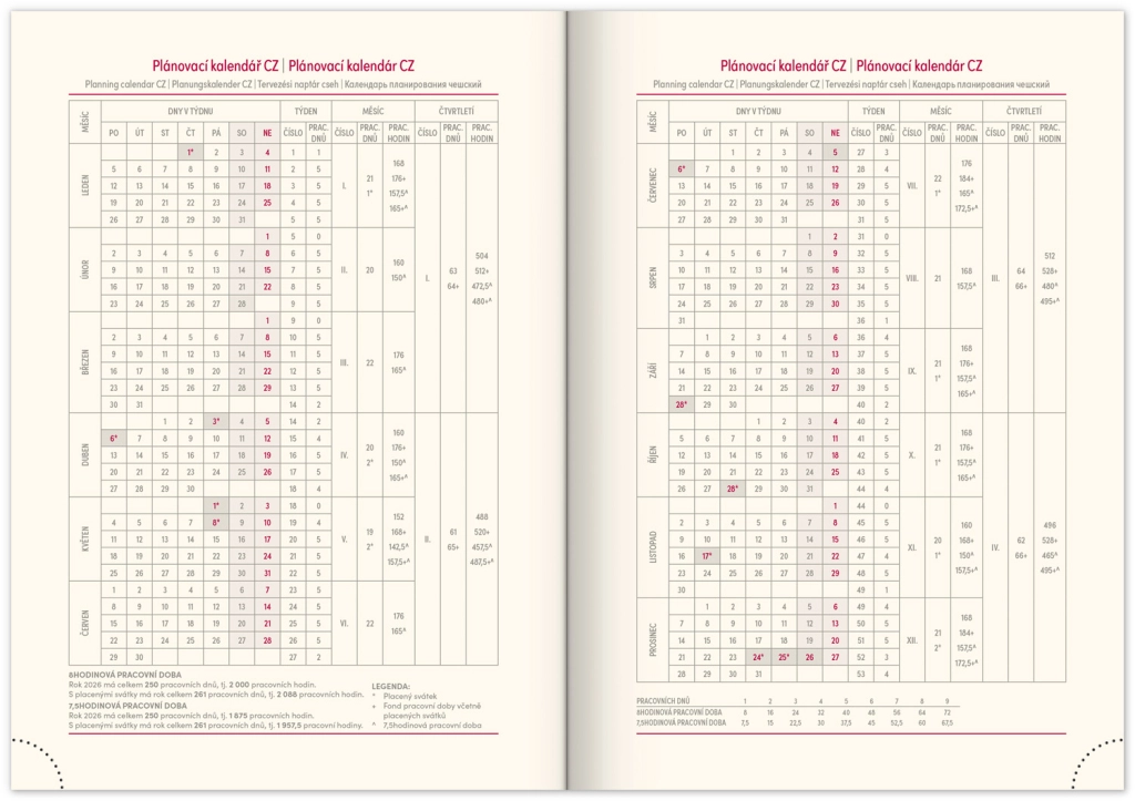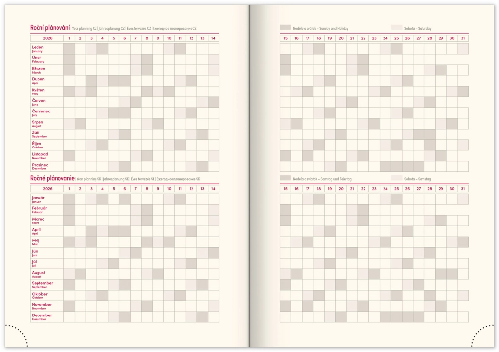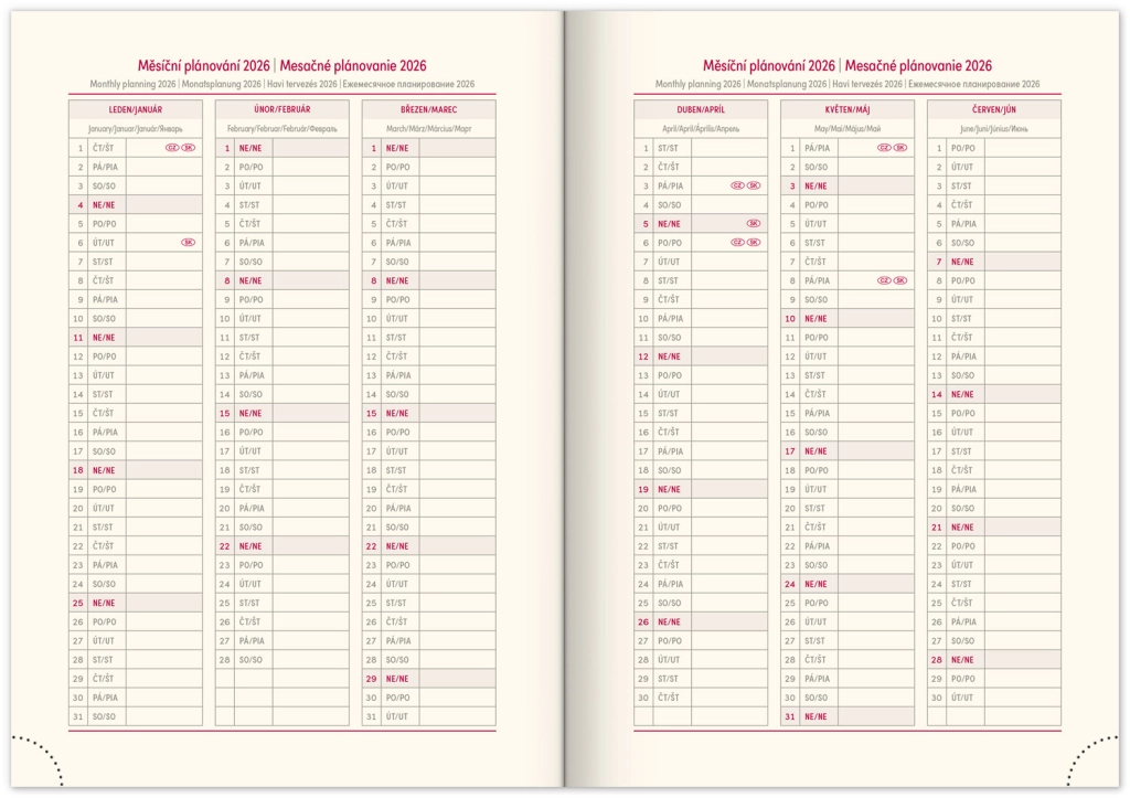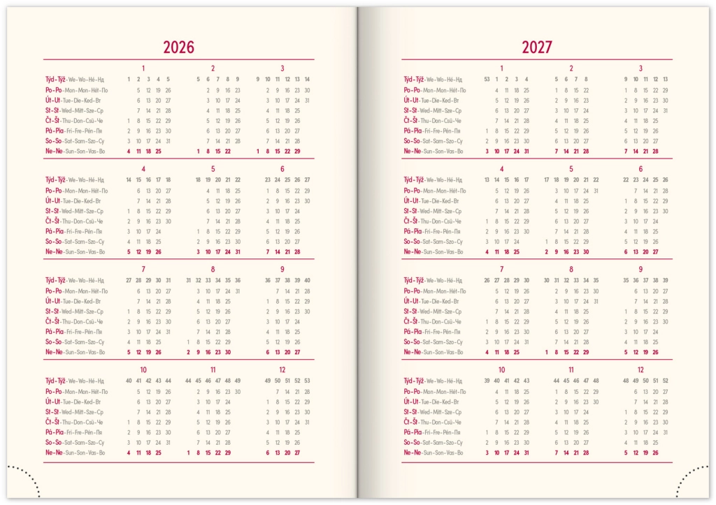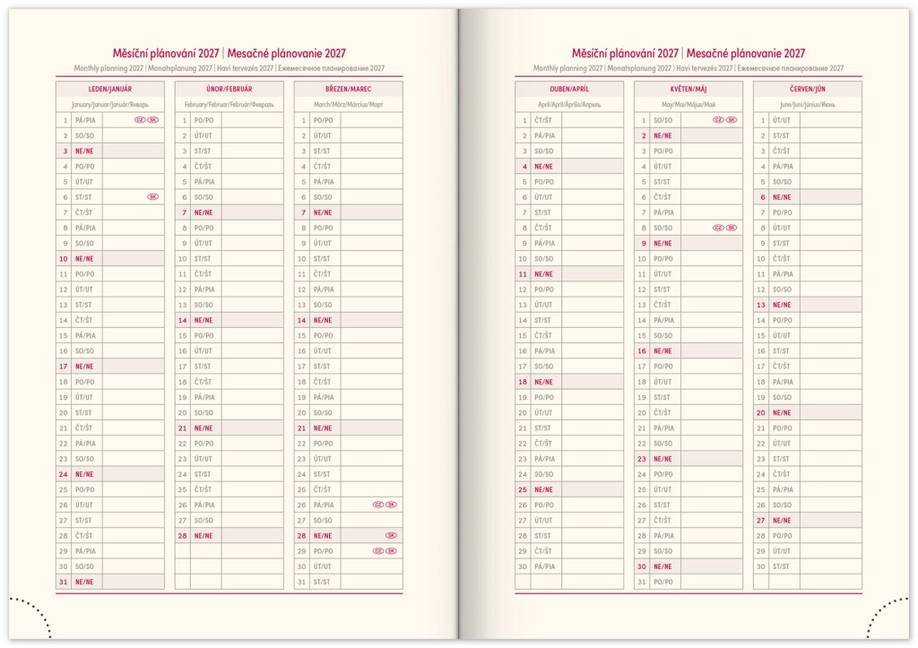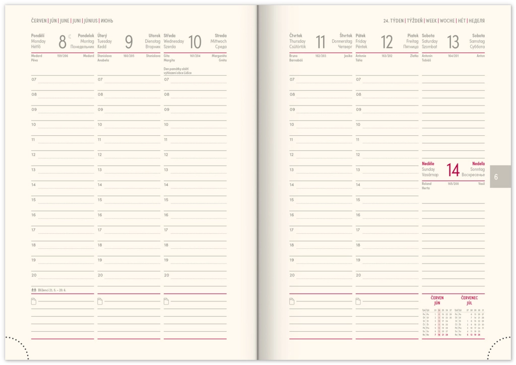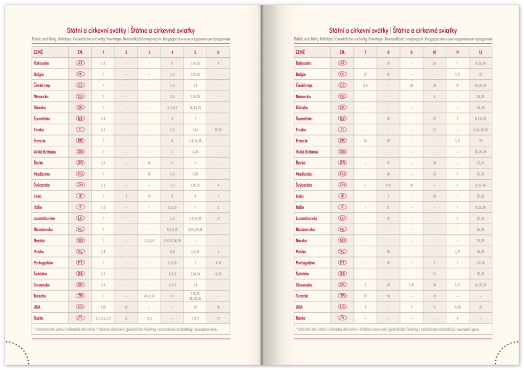 - Εβδομαδιαία διάταξη με τσεχο-σλοβακικό ημερολόγιο και πρόσθετες γλώσσες: αγγλικά, γερμανικά, ουγγρικά και ρωσικά.