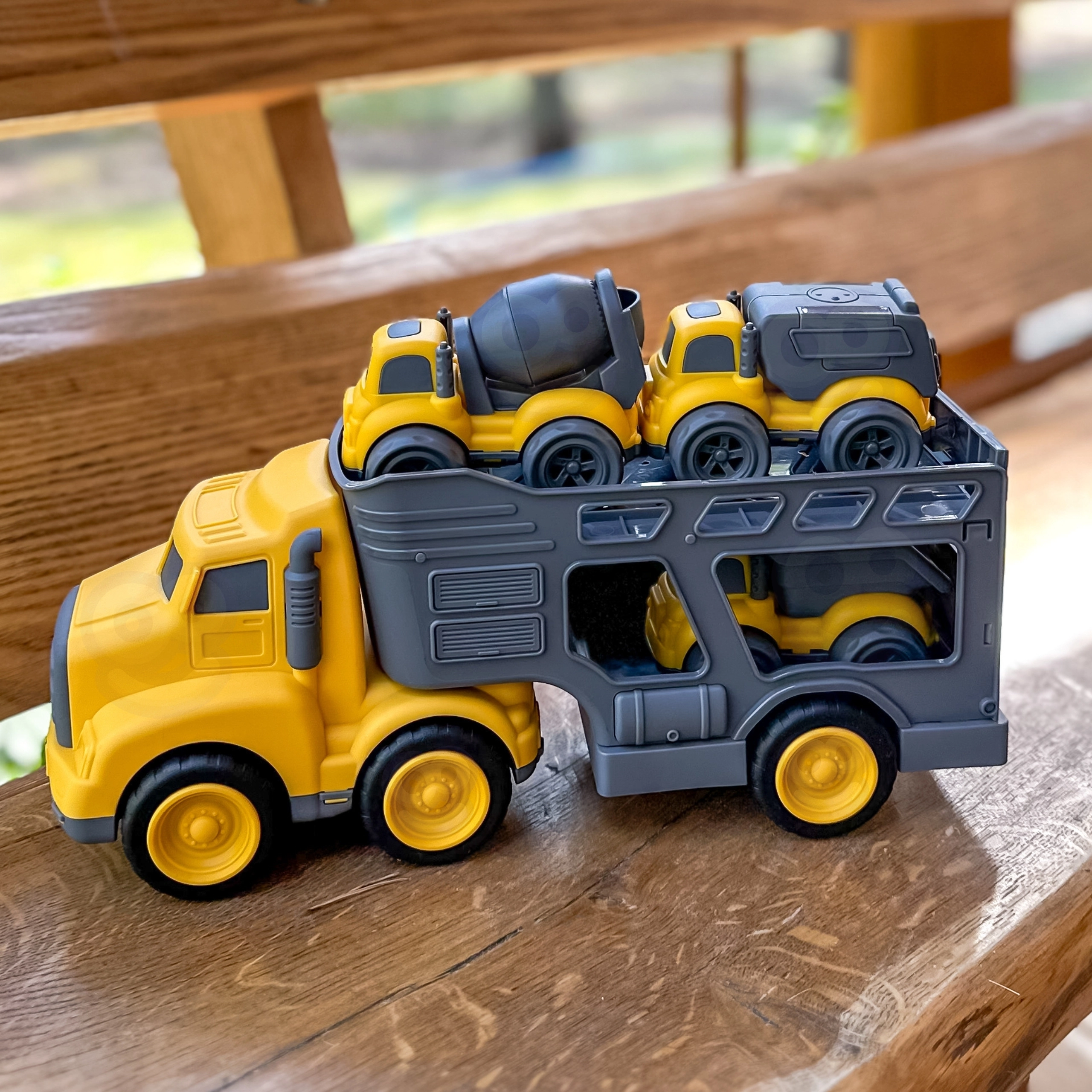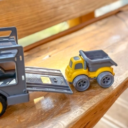 Ο μεγάλος μεταφορέας με ράμπες επιτρέπει εύκολη φόρτωση και μεταφορά και των τριών οχημάτων. Η σταθερή κατασκευή αντέχει ακόμη και έντονο παιδικό παιχνίδι.