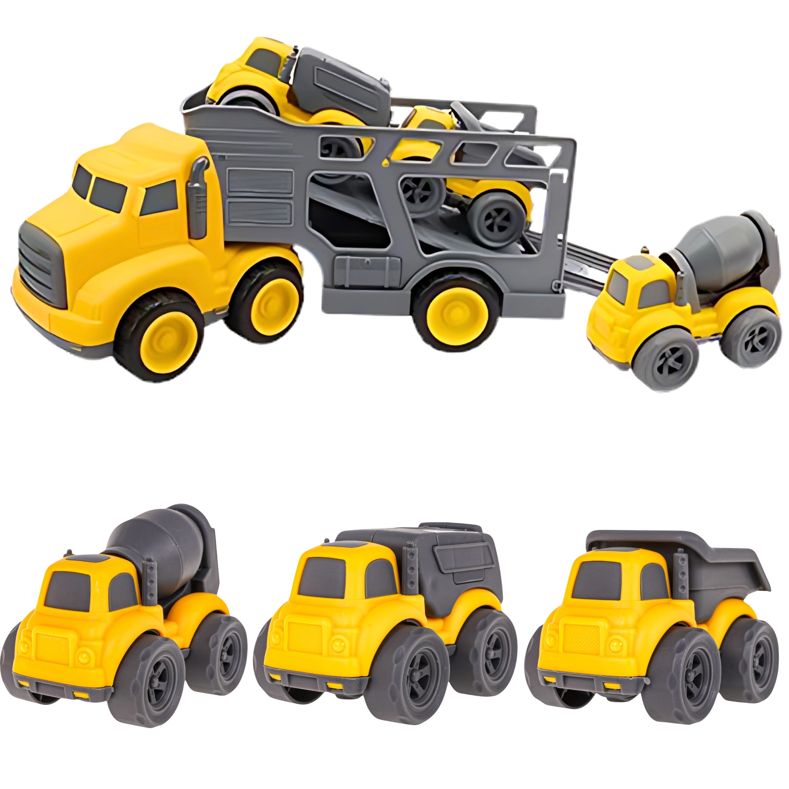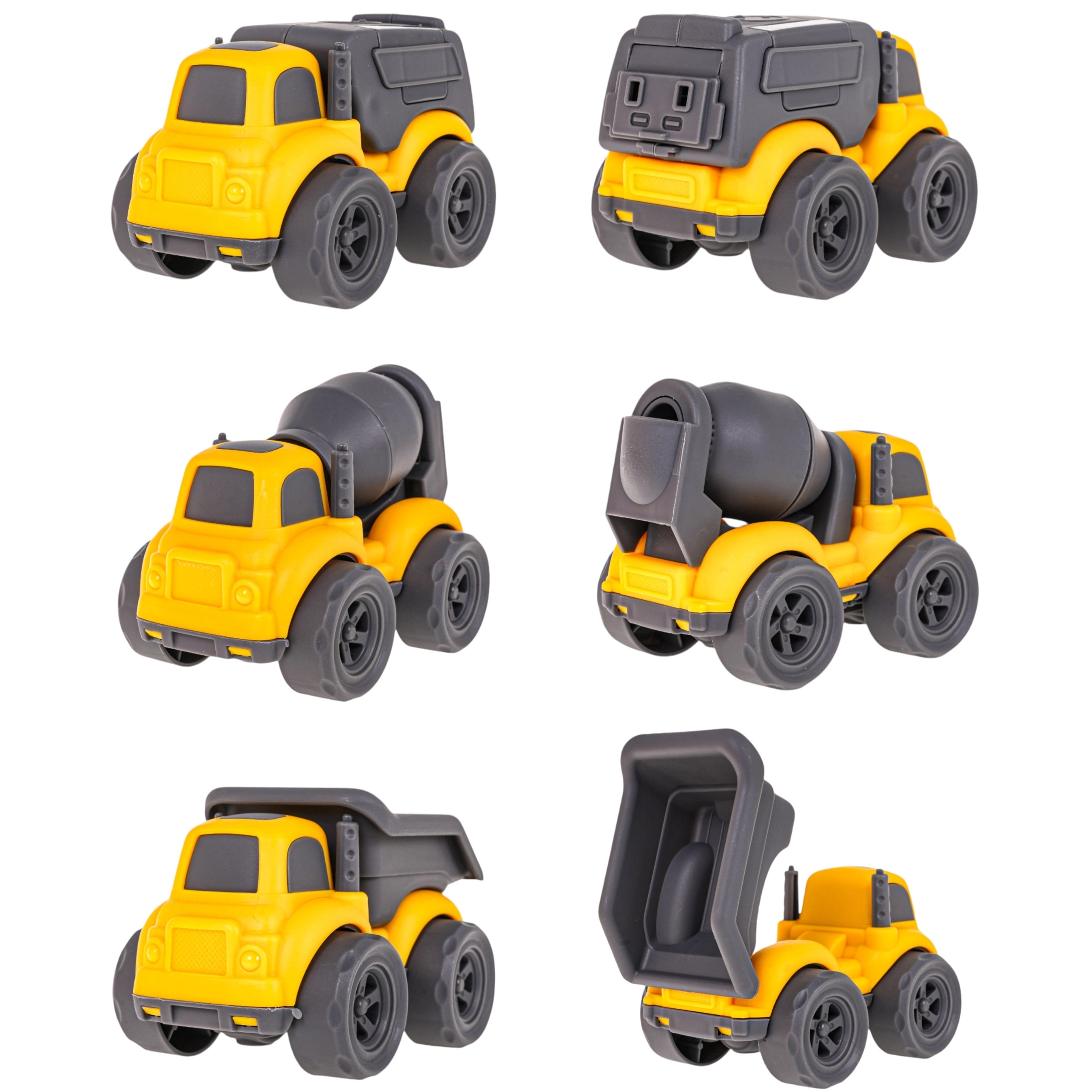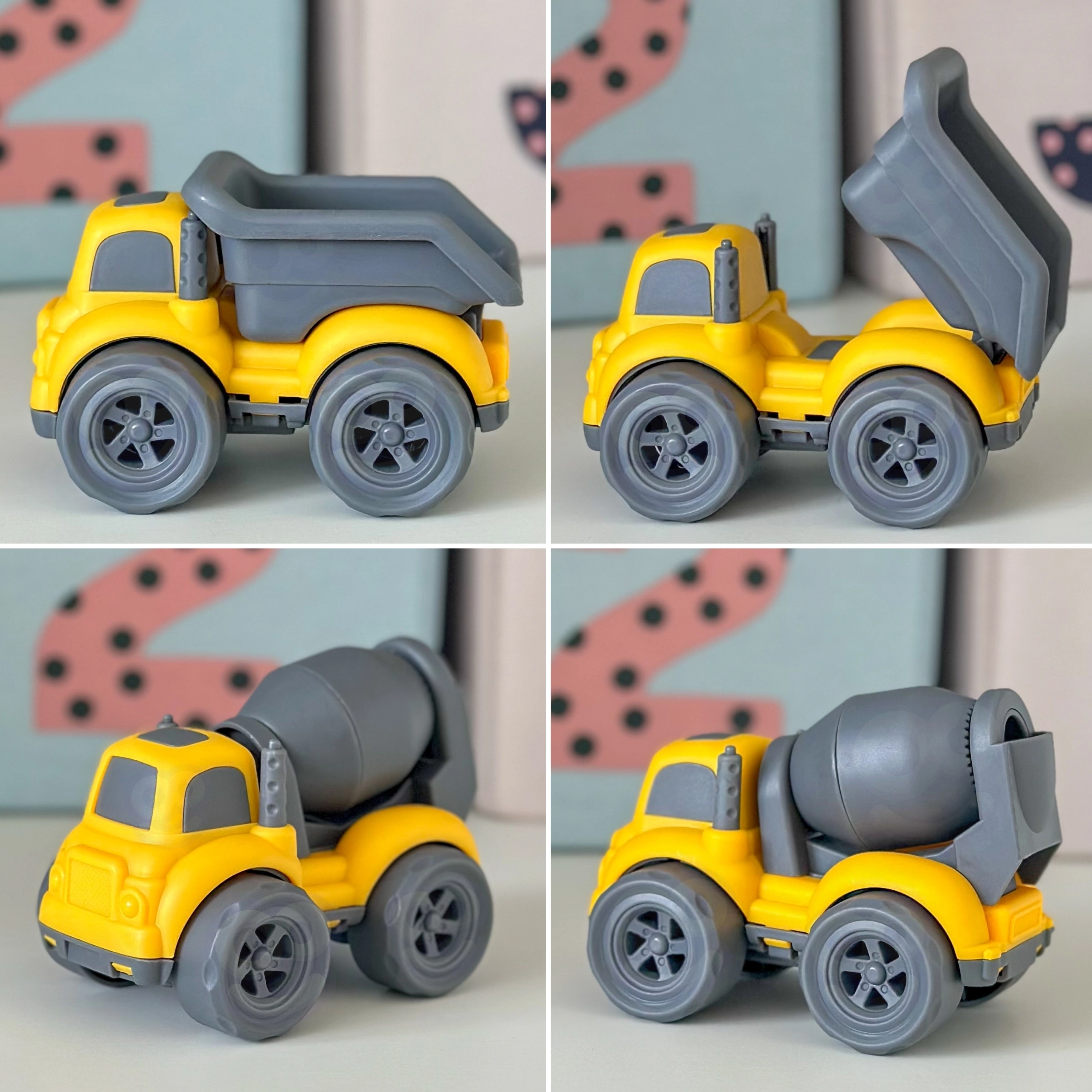 Ανατρεπόμενο με ανακλινόμενο κάδο, μπετονιέρα με περιστρεφόμενο τύμπανο και απορριμματοφόρο για ακόμη πιο ρεαλιστικά σενάρια στο εργοτάξιο.