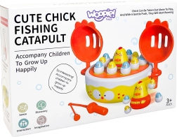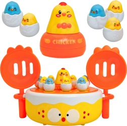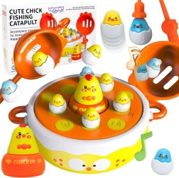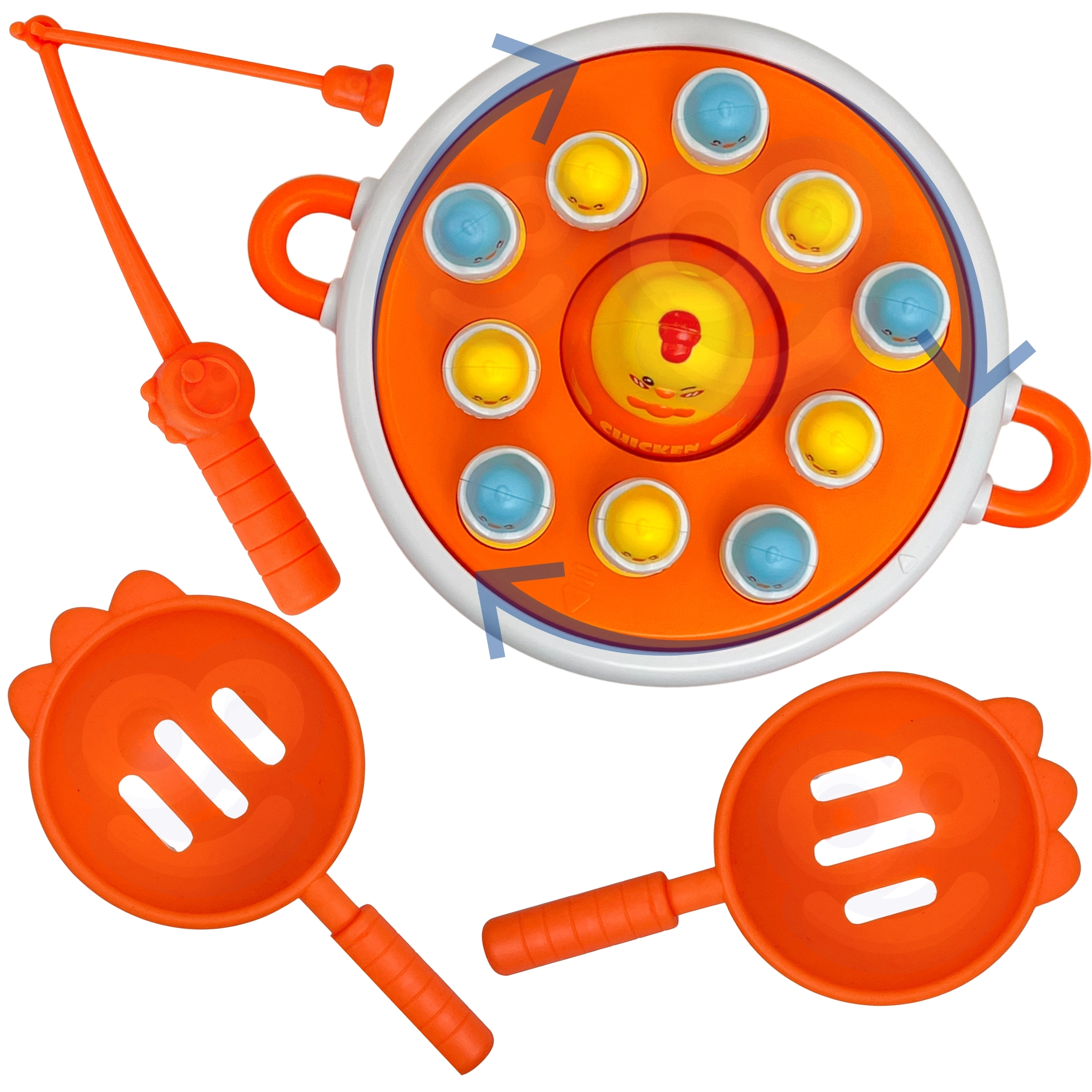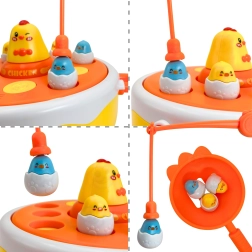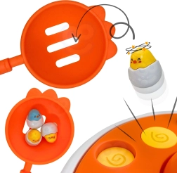 Αυτό το πολυχρηστικό παιχνίδι συνδυάζει έως και τέσσερα παιχνίδια σε ένα σετ, ώστε η διασκέδαση να μην τελειώνει. Η περιστρεφόμενη βάση με μουσική ανασηκώνει τυχαία τα κοτοπουλάκια, τα οποία μπορούν να ψαρευτούν με το μαγνητικό καλάμι ή να πιαστούν με τα φτυαράκια μετά την εκτόξευσή τους από τον καταπέλτη. Το μεγαλύτερο αποσπώμενο κοτοπουλάκι λειτουργεί ως παιχνιδιάρικο αυτοκινητάκι.