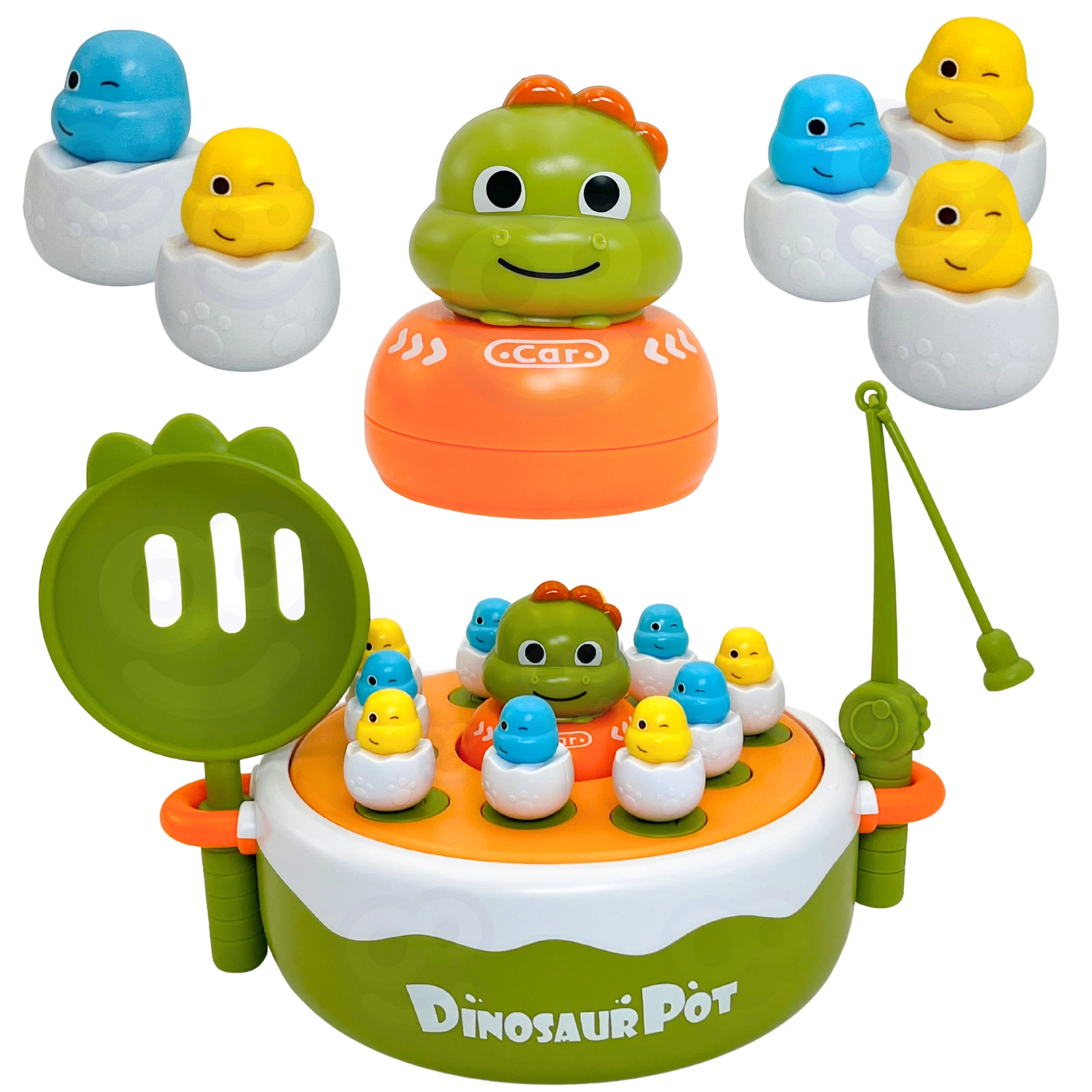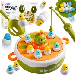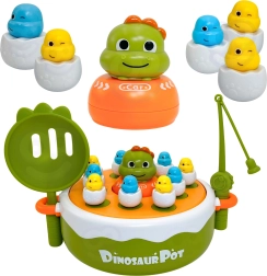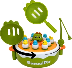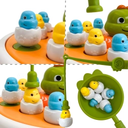 Ταξιδέψτε με τα παιδιά στην προϊστορία με το διαδραστικό παιχνίδι της WOOPIE. Αυτό το πολυλειτουργικό σετ 4σε1 συνδυάζει μαγνητικό ψάρεμα, διασκεδαστικό παιχνίδι καταπέλτη, μίνι αυτοκινητάκι–δεινόσαυρο και στην πίσω πλευρά της βάσης επίσης τρίλιζα. Τα πολύχρωμα φιγουράκια δεινο–κλωσσόπουλων σε «τσόφλια» και ο επιδέξιος χειρισμός με καλάμια και φτυαράκια καλλιεργούν τη λεπτή κινητικότητα, τις δεξιότητες συντονισμού και τη συνεργατική παιχνίδι για δύο.