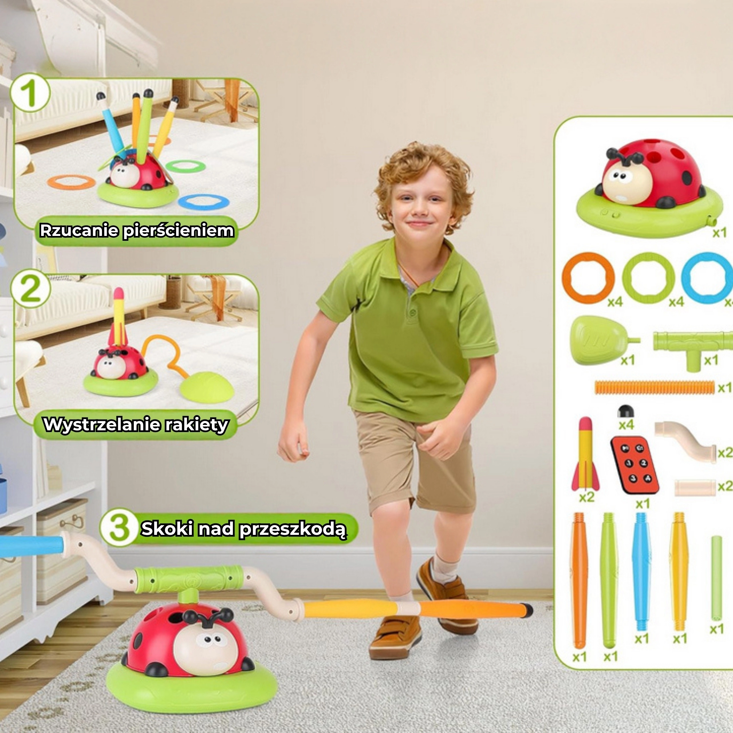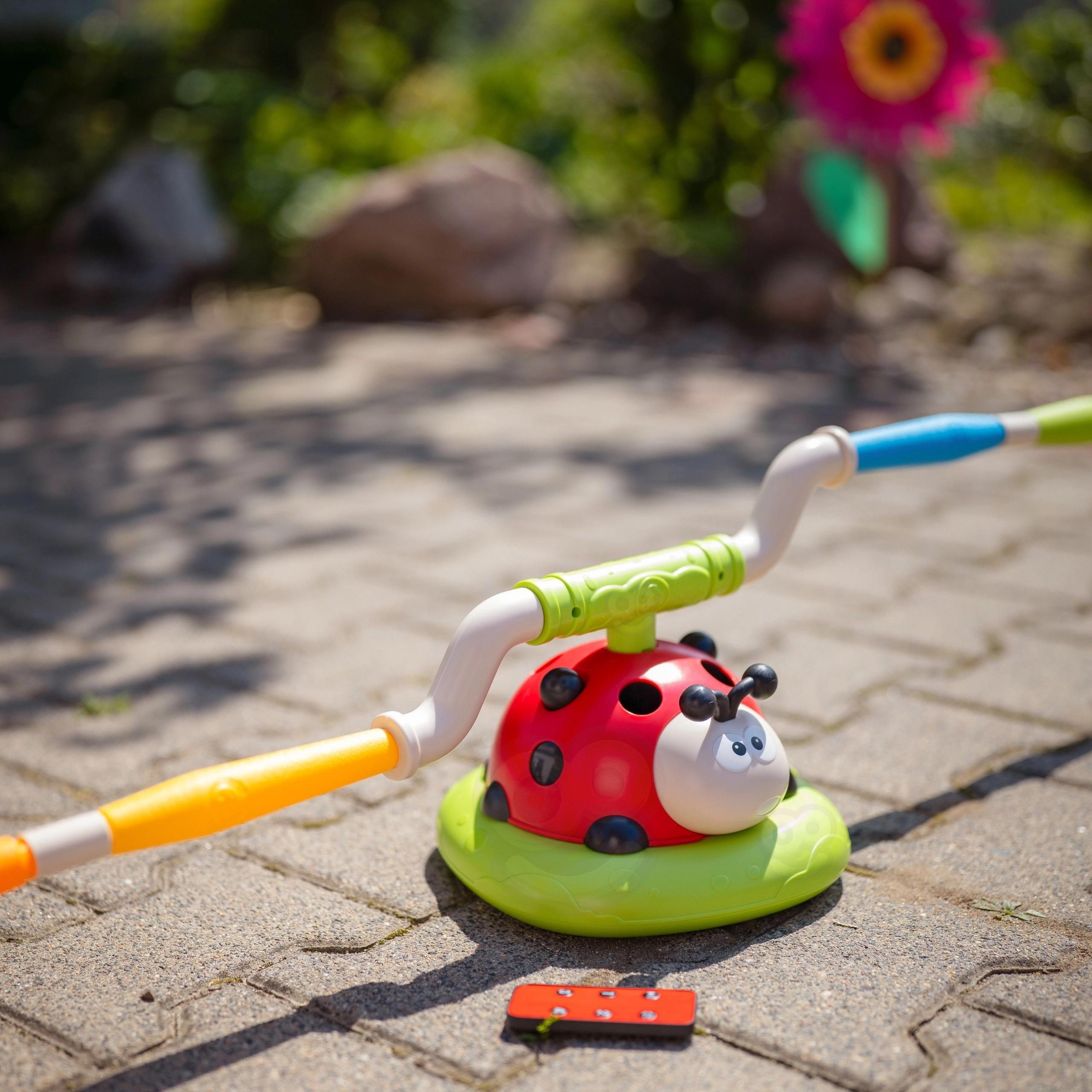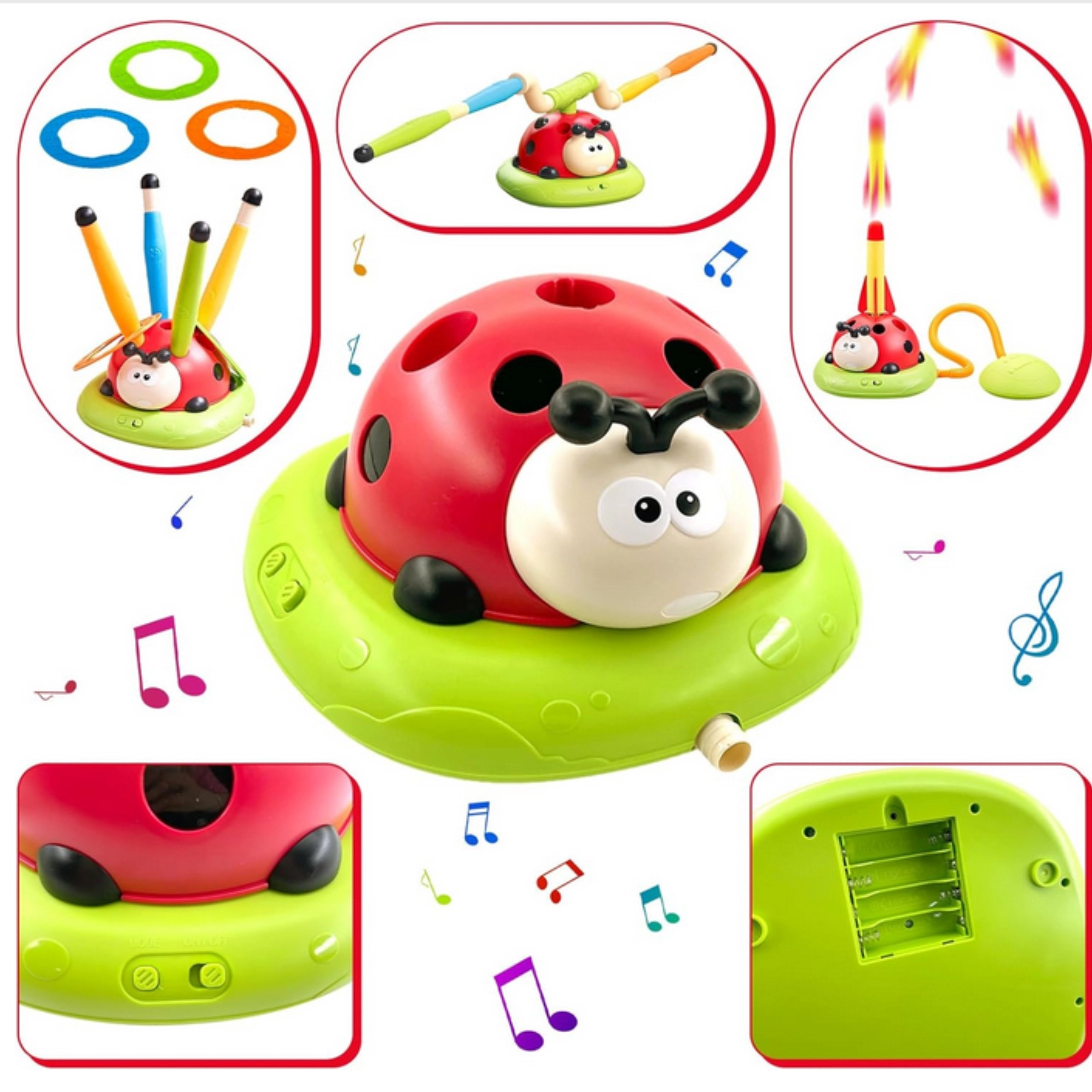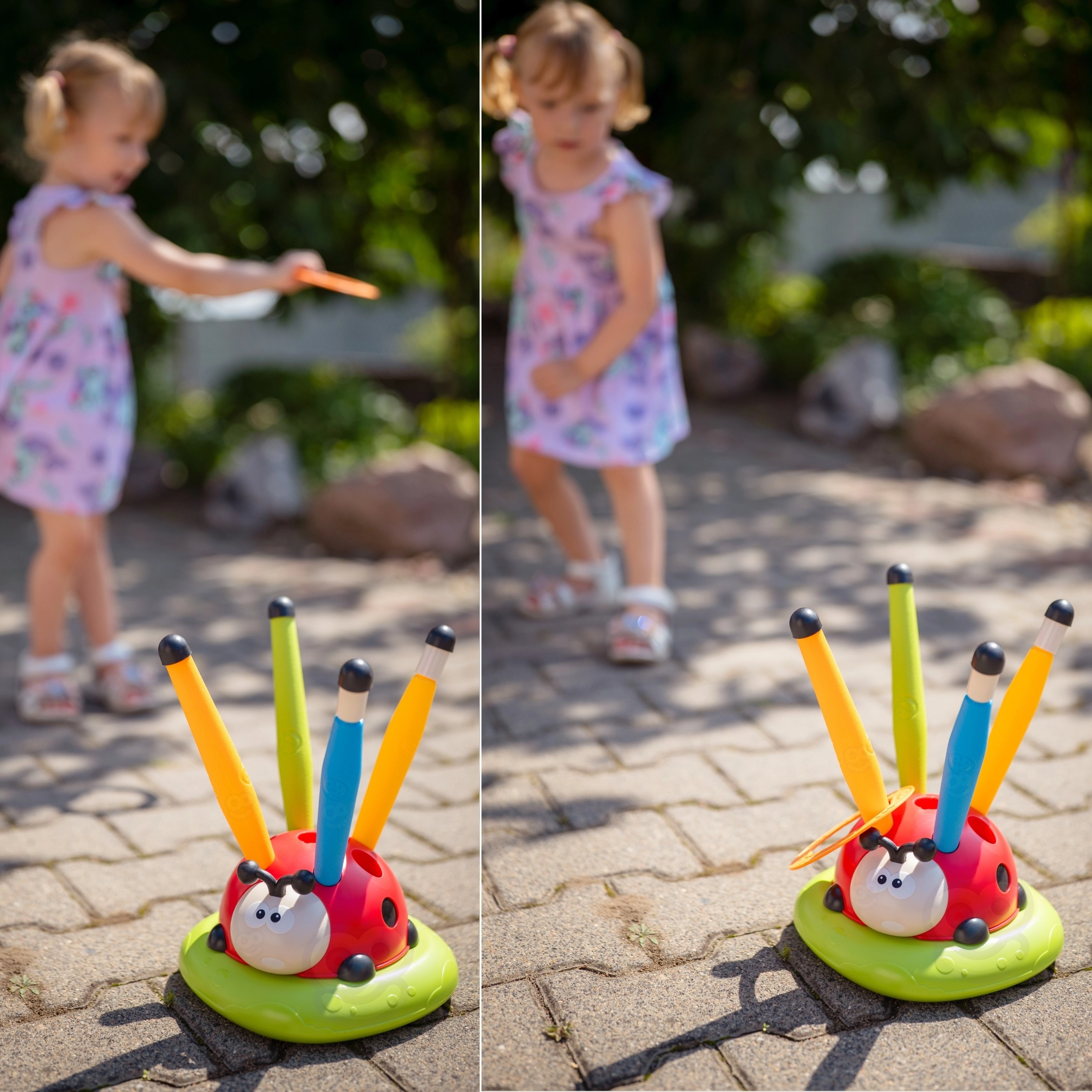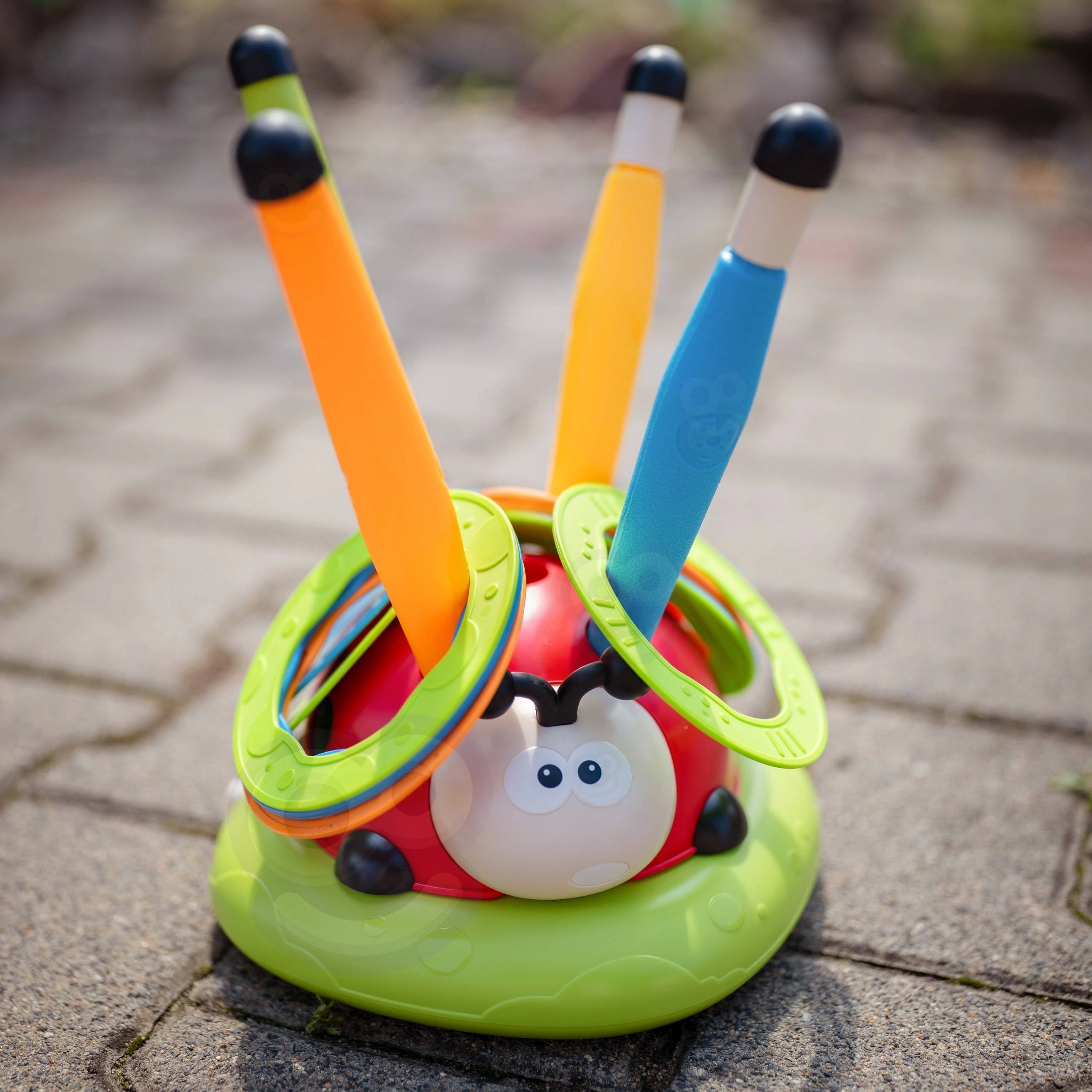 - - Περιλαμβάνει 12 χρωματιστούς δακτυλίους, τους οποίους τα παιδιά ρίχνουν στην περιστρεφόμενη πασχαλίτσα. Εξαιρετική δραστηριότητα για την ανάπτυξη αντανακλαστικών και ακρίβειας.
