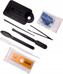 - Το σετ περιλαμβάνει: εργαλεία προετοιμασίας δειγμάτων, βασικές αντικειμενοφόρες πλάκες, φιαλίδια αποθήκευσης δειγμάτων, πανάκι καθαρισμού και βάση για τηλέφωνο.