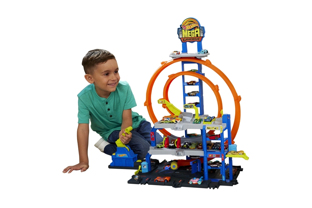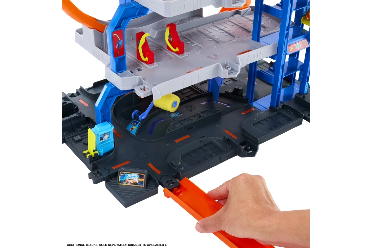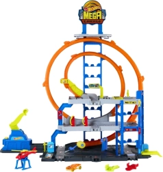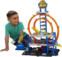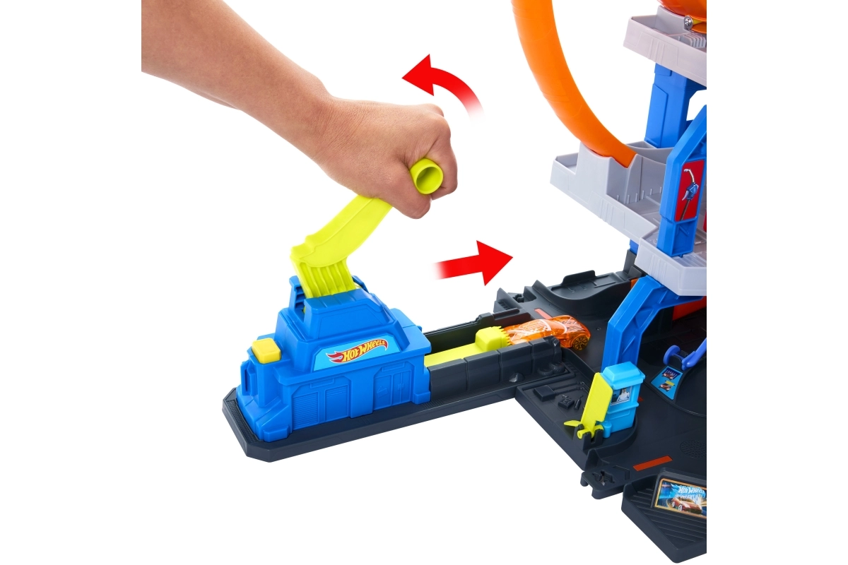 Το μέγκα γκαράζ Hot Wheels City προσφέρει δυναμικό παιχνίδι σε τρία επίπεδα – από το πλυντήριο στο ισόγειο, μέσω του χειροκίνητου ανελκυστήρα, μέχρι την εκκίνηση από τον πάνω όροφο. Ο εκτοξευτής στέλνει τα αυτοκίνητα στη διπλή λούπα, ενώ οι διακόπτες ορίζουν σε ποιον όροφο θα καταλήξει το όχημα. Ιδανικό για ατομικό και ομαδικό παιχνίδι.