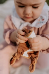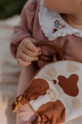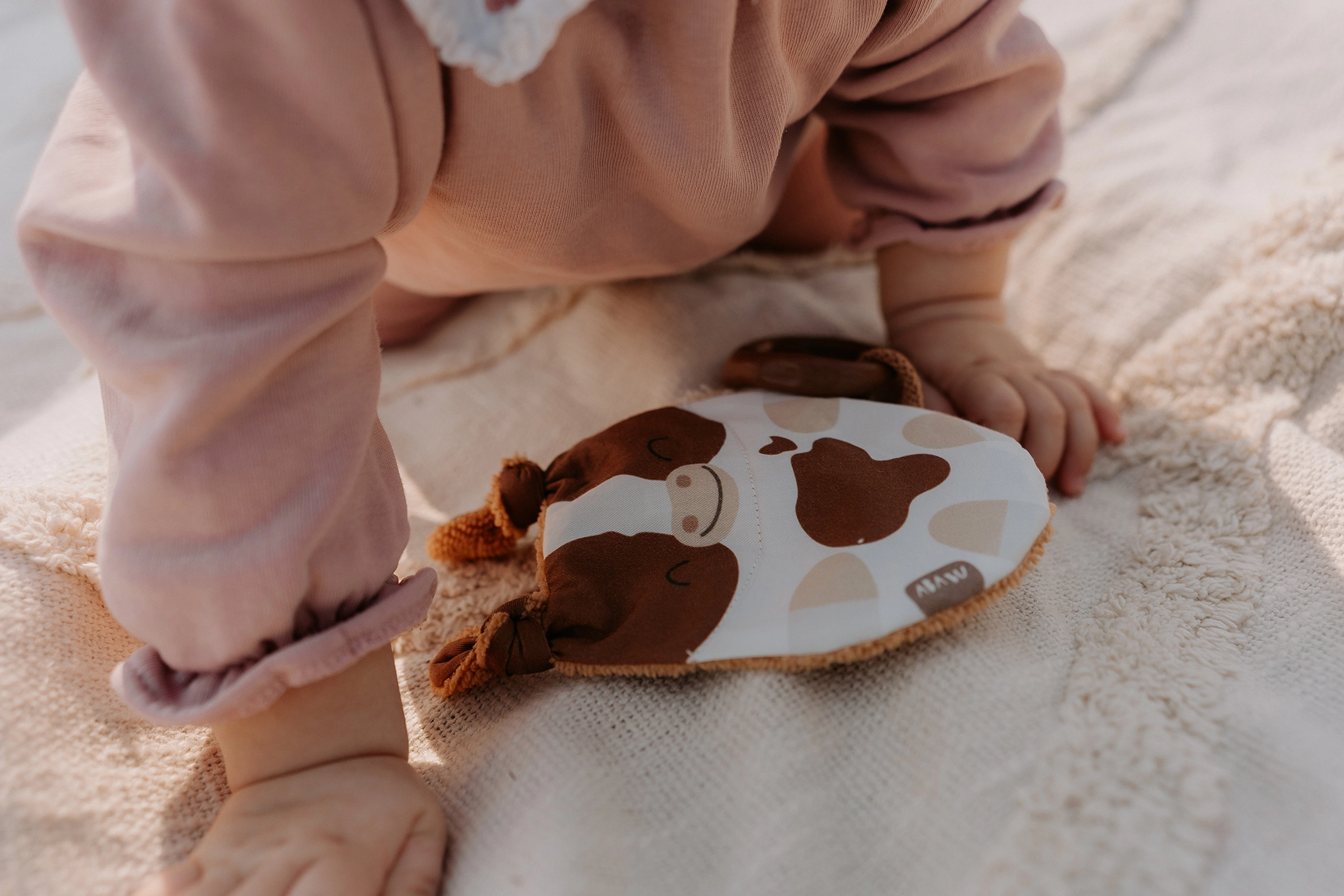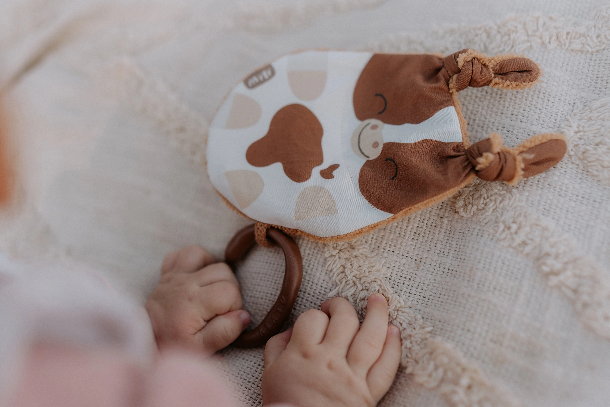 Κατασκευασμένο από ποιοτικά υλικά, το παιχνίδι Μοσχαράκι προσφέρει πλήθος ενδιαφερόντων στοιχείων που αναπτύσσουν τις αισθήσεις των μικρών σας. Το πρόσωπο είναι από τυπωμένο ύφασμα 100% βαμβάκι, με πιστοποίηση για παιδιά έως 3 ετών. Η πίσω πλευρά από μπαμπού φροτέ προσφέρει απαλή και ευχάριστη υφή.