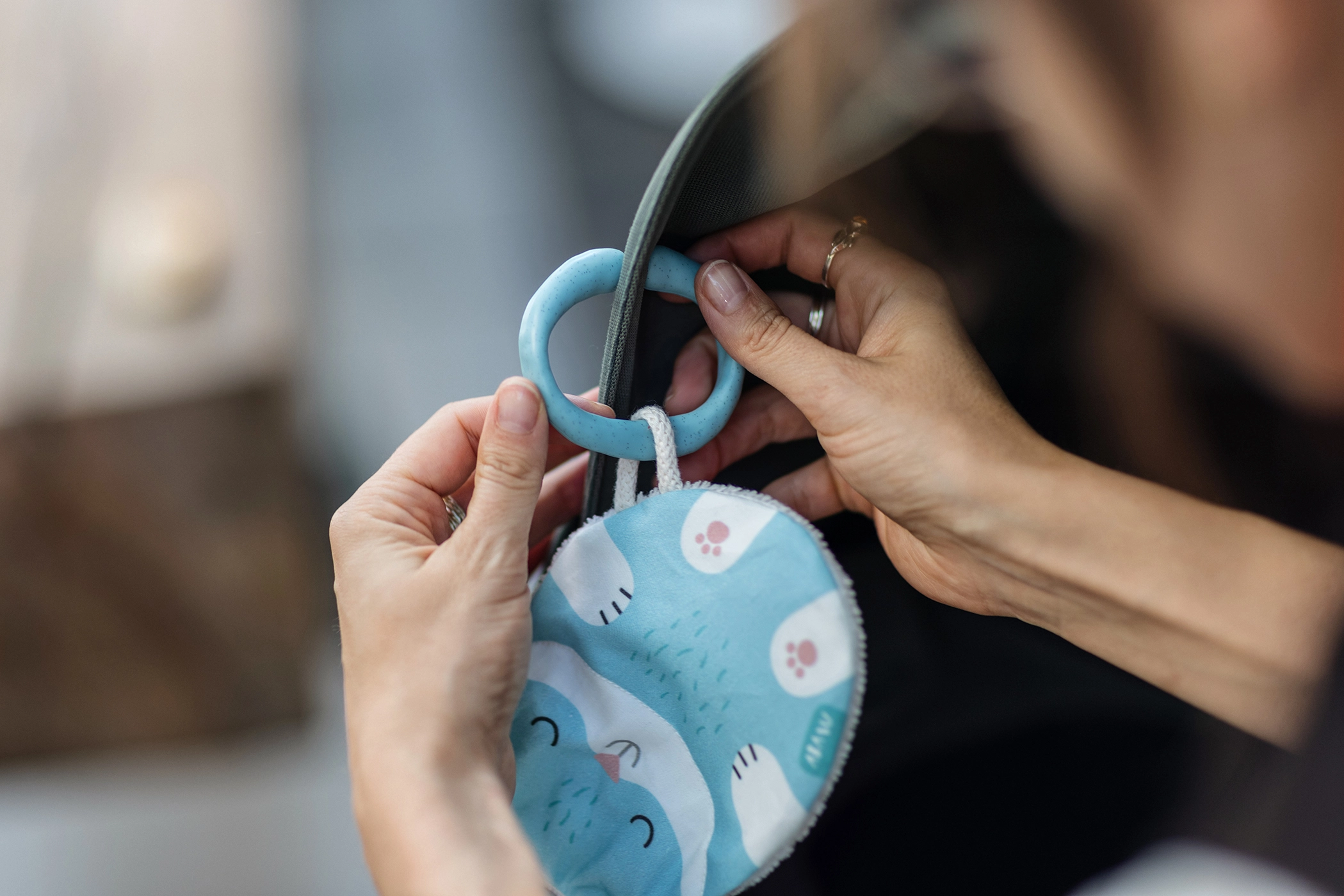 Η φροντίδα του παιχνιδιού είναι απλή. Πριν από την πρώτη χρήση συνιστούμε να το πλύνετε χωρίς τον κρίκο. Αν ο κρίκος φθαρεί, μπορείτε εύκολα να τον αντικαταστήσετε με καινούργιο. Μην σιδερώνετε το παιχνίδι και μην το στεγνώνετε σε στεγνωτήριο. Μικρές ατέλειες στην εκτύπωση είναι συνηθισμένες και δεν θεωρούνται ελάττωμα.