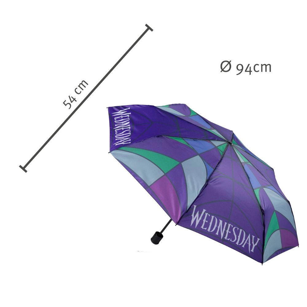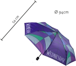 Στυλάτη πτυσσόμενη ομπρέλα με σκοτεινά κομψό μοτίβο Wednesday, ιδανική για σακίδιο και τσάντα. Η συμπαγής κατασκευή επιτρέπει εύκολη μεταφορά και αξιόπιστη προστασία από τη βροχή.
