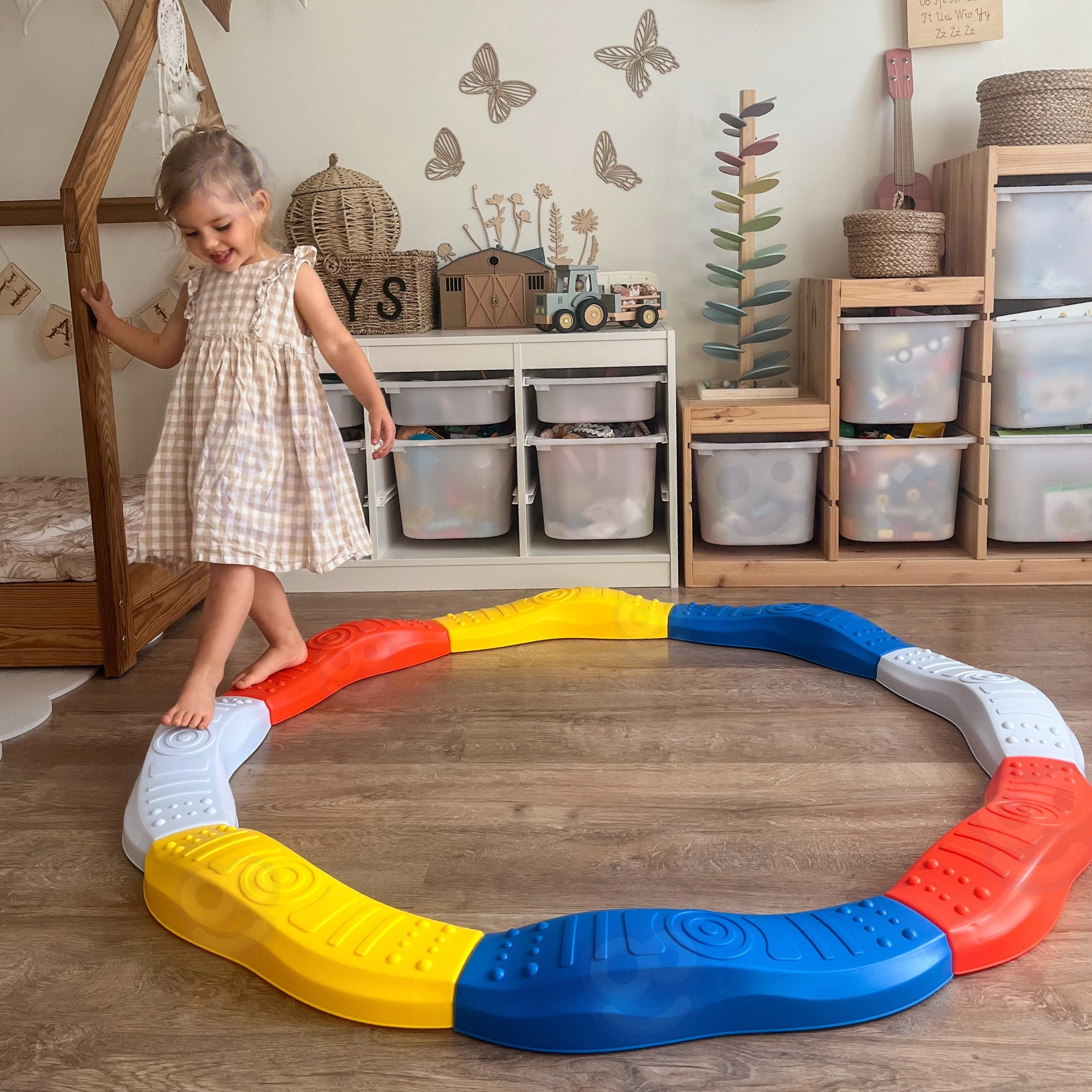 Δημιουργήστε έναν κύκλο διαμέτρου περίπου 130 cm, μια ζιγκ-ζαγκ «φιδίσια» διαδρομή ή μικρότερους κύκλους. Η διαδρομή είναι κατάλληλη για παιδικό δωμάτιο, αίθουσα παιχνιδιού και κήπο – αρκεί μια επίπεδη επιφάνεια. Ιδανική για την αδρή κινητικότητα, την ιδιοδεκτικότητα και μια διασκεδαστική προπόνηση ισορροπίας ξυπόλητα ή με κάλτσες.