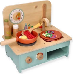 Τα αξεσουάρ περιλαμβάνουν τηγάνι, σπάτουλα, πιάτα και απομιμήσεις τροφίμων, που ενισχύουν το δημιουργικό παιχνίδι ρόλων.