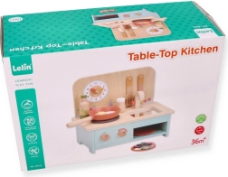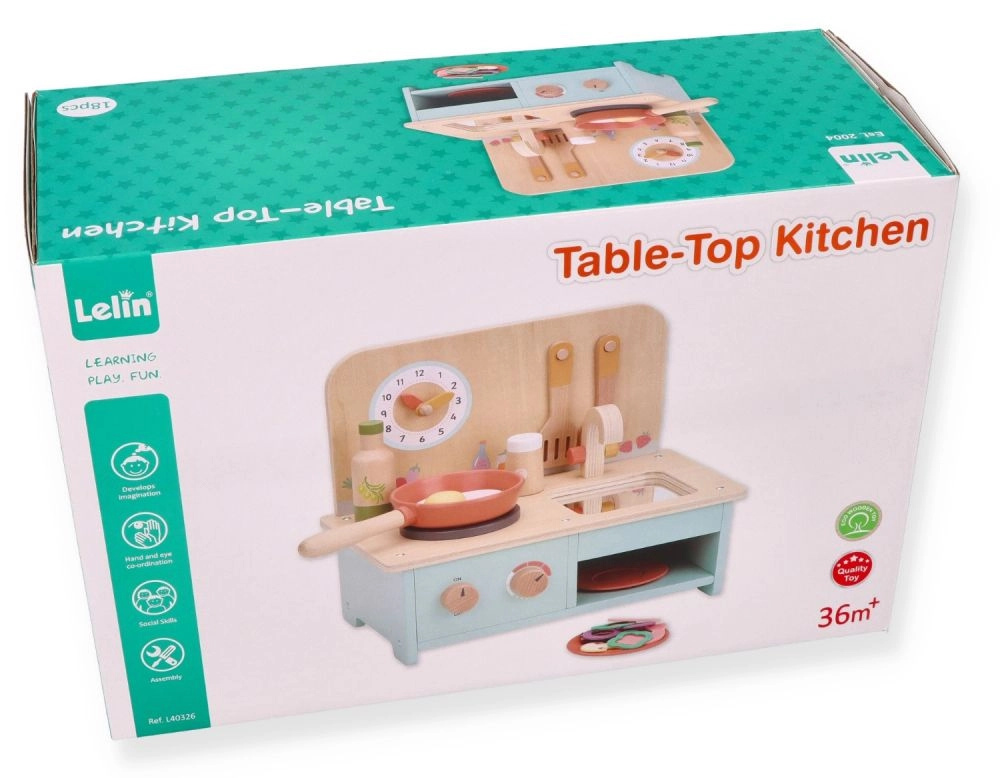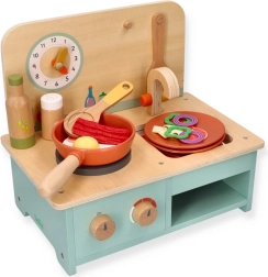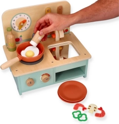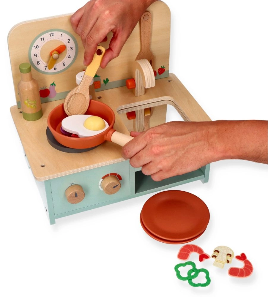 Αυτή η compact ξύλινη κουζίνα προσφέρει στα παιδιά την ευκαιρία να συμμετέχουν σε δραστηριότητες παιχνιδιού ρόλων και να αναπτύξουν τις δεξιότητές τους. Είναι ειδικά σχεδιασμένη για παιδιά από 3 ετών και άνω, γεγονός που την καθιστά ιδανική για προσχολικές ηλικίες. Η κουζίνα είναι εξοπλισμένη με ρεαλιστικές λεπτομέρειες όπως περιστρεφόμενα κουμπιά και ρολόι.