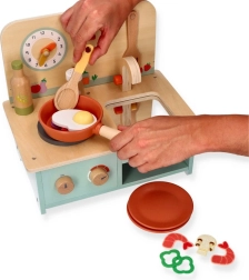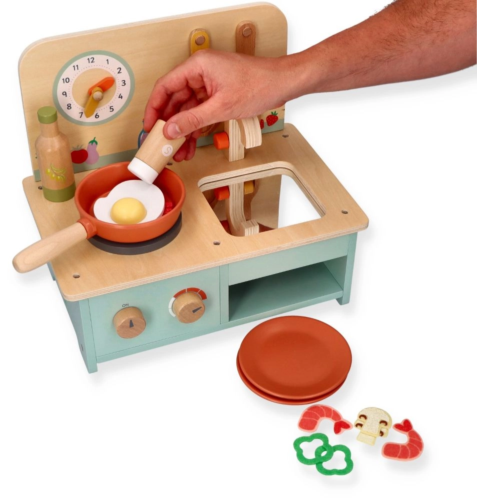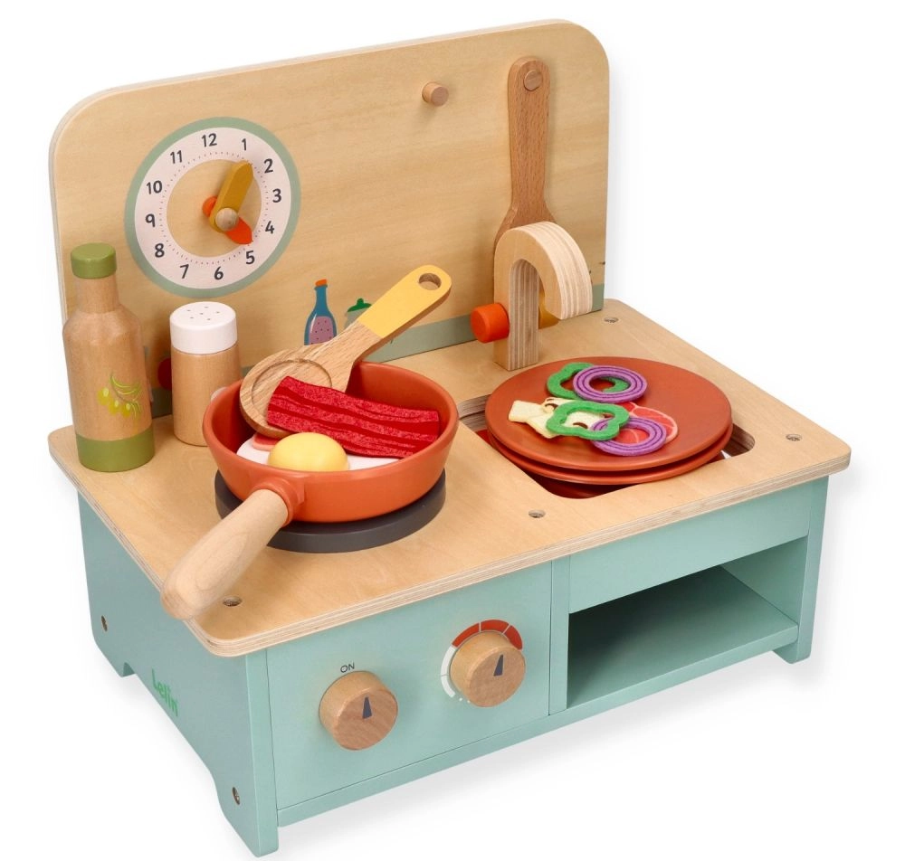 Η ξύλινη κουζίνα διαθέτει ρεαλιστικά στοιχεία όπως περιστρεφόμενα κουμπιά και ρολόι, που προσφέρουν αυθεντική εμπειρία παιχνιδιού.