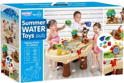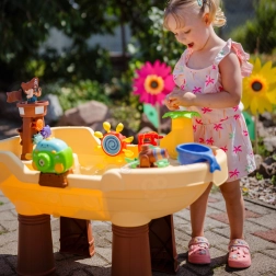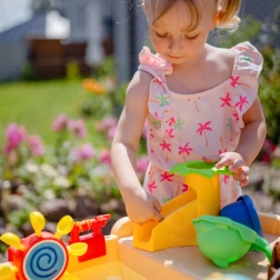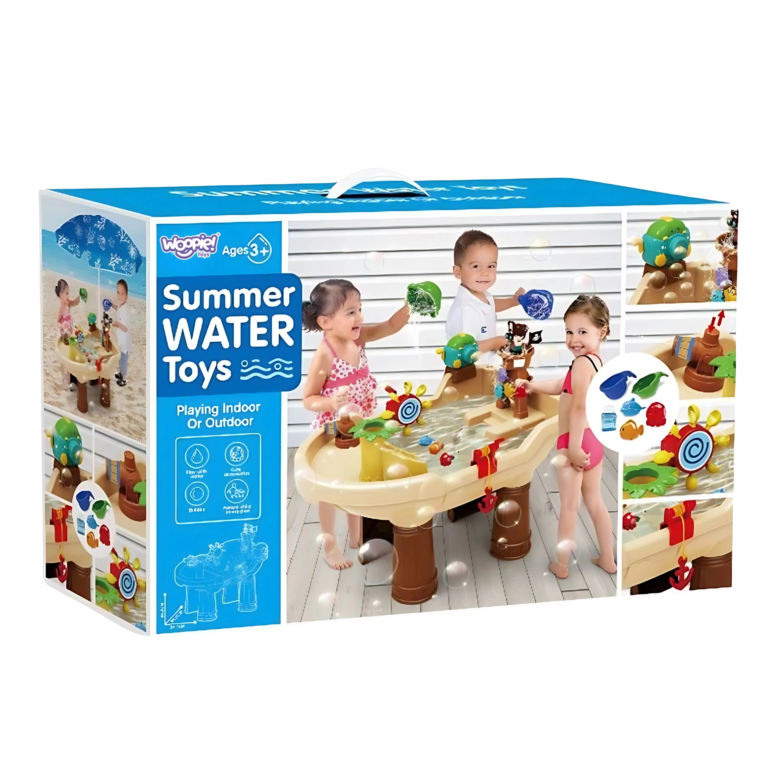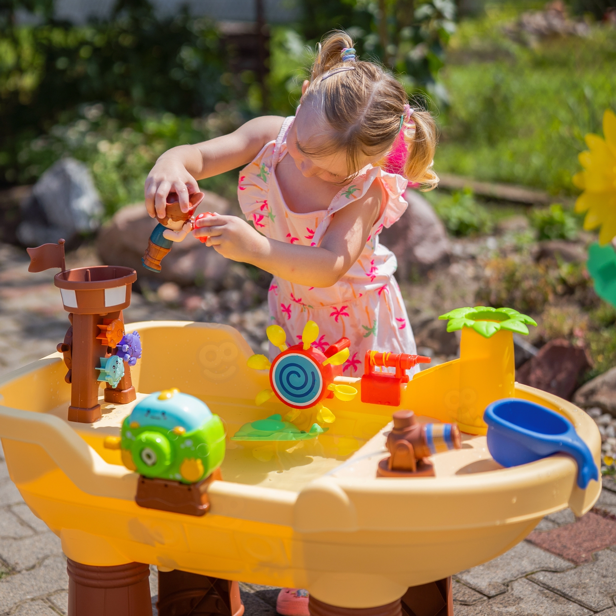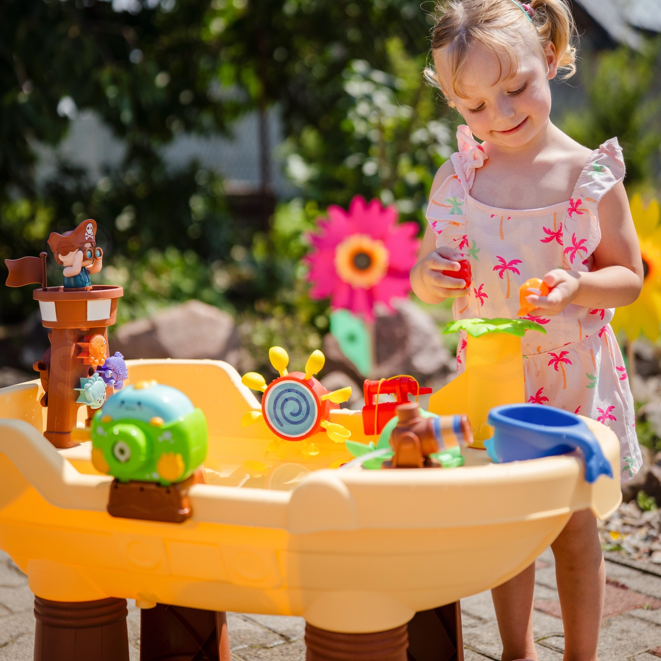 Το υδάτινο και αμμώδες τραπέζι Woopie σε σχήμα πειρατικού πλοίου μετατρέπει την αυλή σε κόλπο περιπέτειας. Τα παιδιά μπορούν να ρίχνουν νερό από το κανόνι, να το αφήνουν να κυλάει από την τσουλήθρα, να περιστρέφουν μικρούς και μεγάλους υδροτροχούς και να φυσούν σαπουνόφουσκες. Χάρη στα σταθερά πόδια και το ποιοτικό πλαστικό, το τραπέζι είναι ανθεκτικό, ασφαλές και κατάλληλο για καθημερινό παιχνίδι.