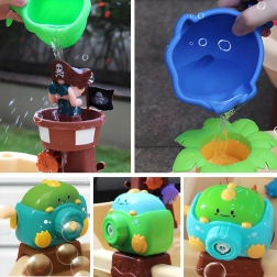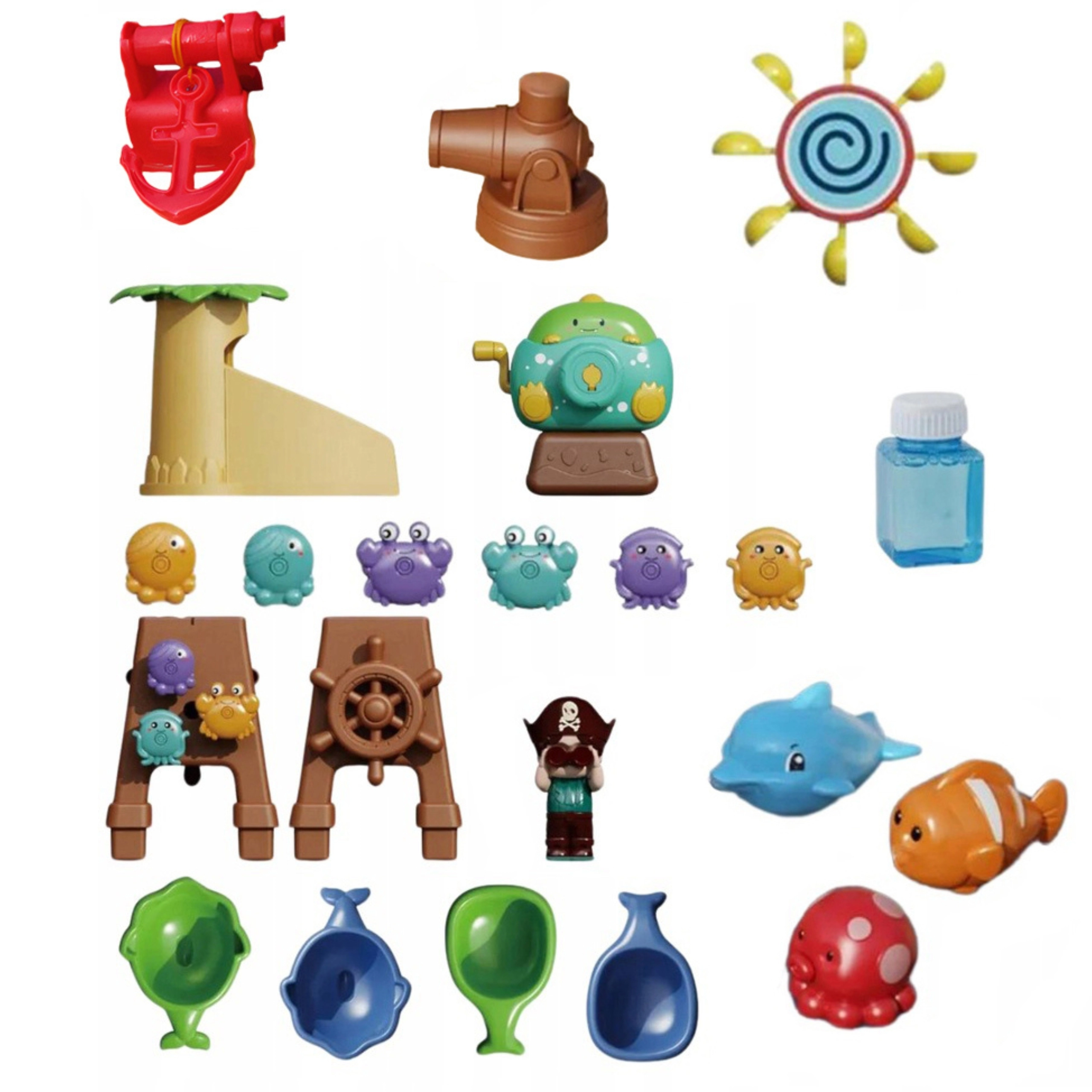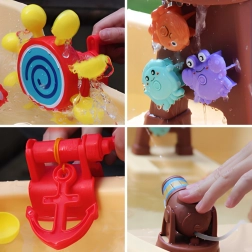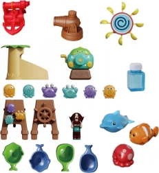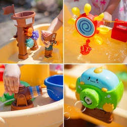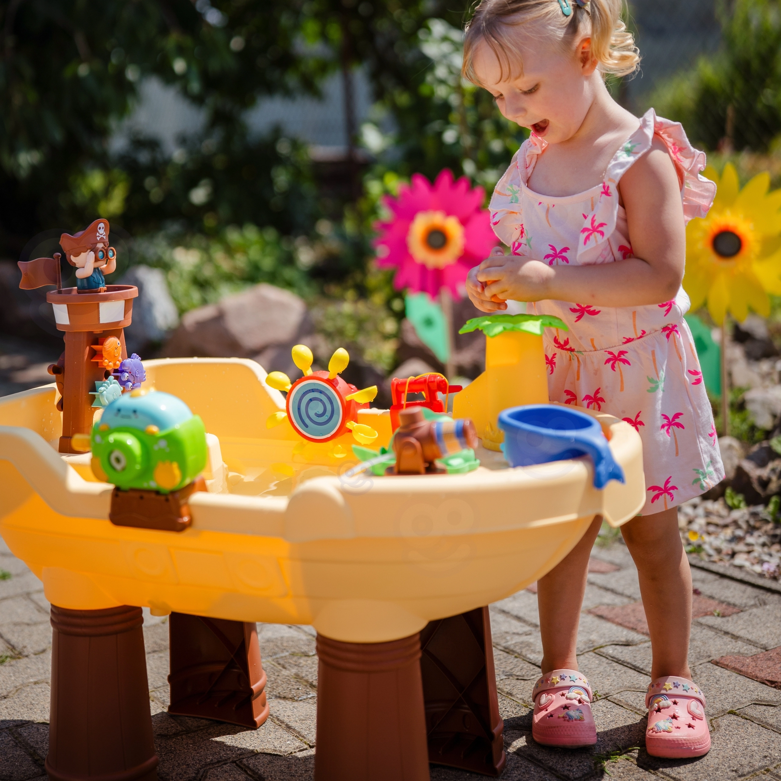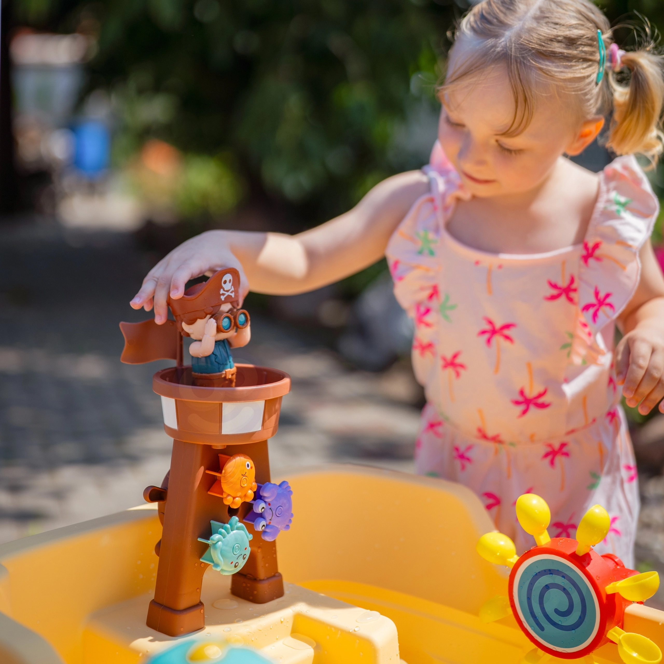 Το σετ περιλαμβάνει πειρατικό πύργο με φωλιά, φιγούρα πειρατή, άγκυρα, ποτηράκια για μεταγγίσεις και ζωάκια που επιπλέουν, τα οποία υποστηρίζουν τη αισθητηριακή εξερεύνηση, τον συντονισμό χεριού–ματιού και τη δημιουργικότητα. Ο μεγάλος χώρος επιτρέπει άνετο κοινό παιχνίδι πολλών παιδιών και η απλή κατασκευή διευκολύνει το άδειασμα του νερού και τη συντήρηση.