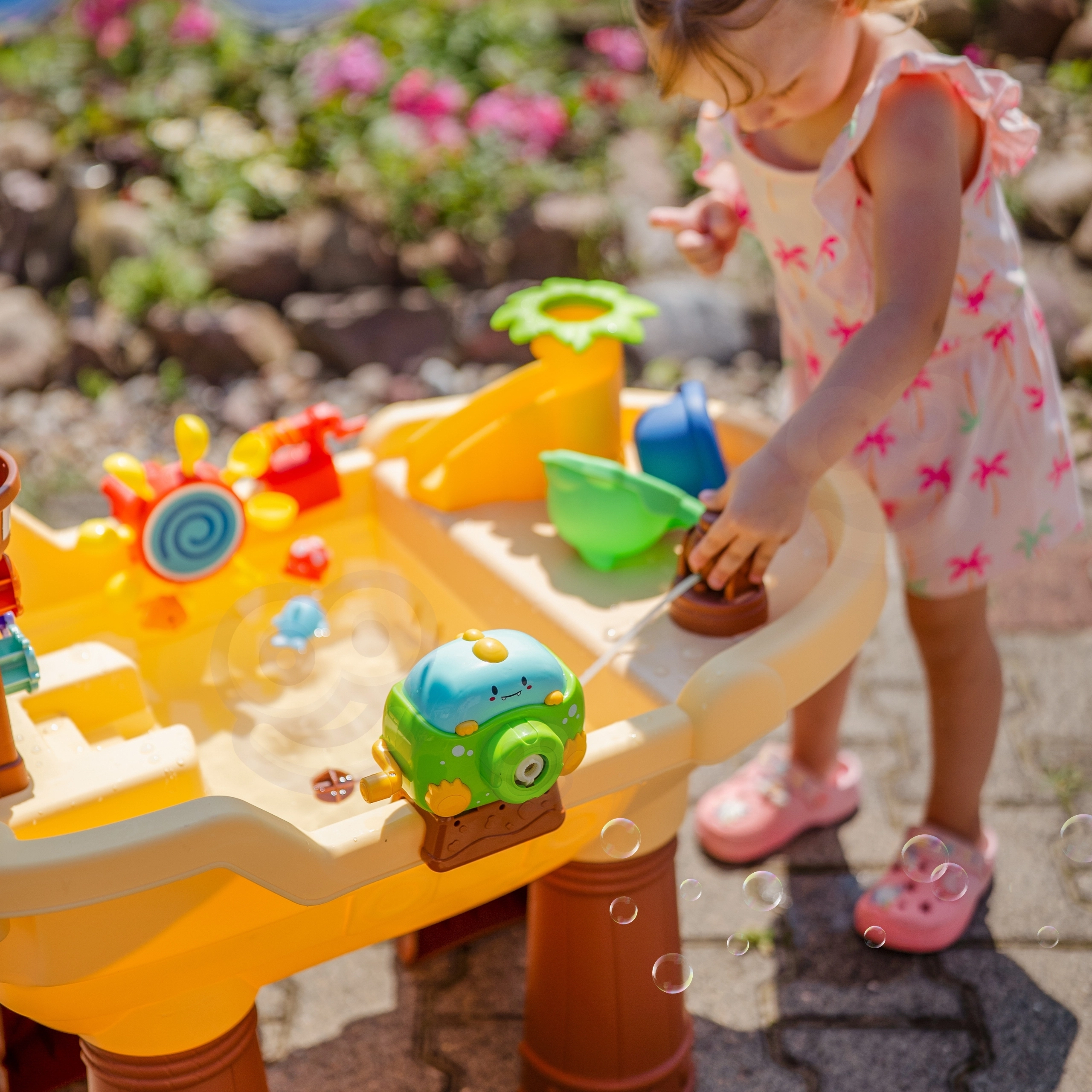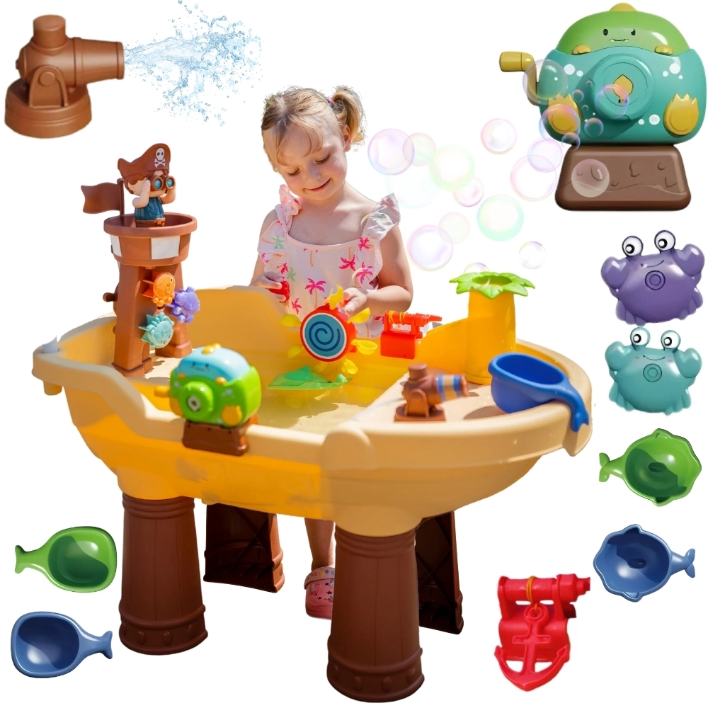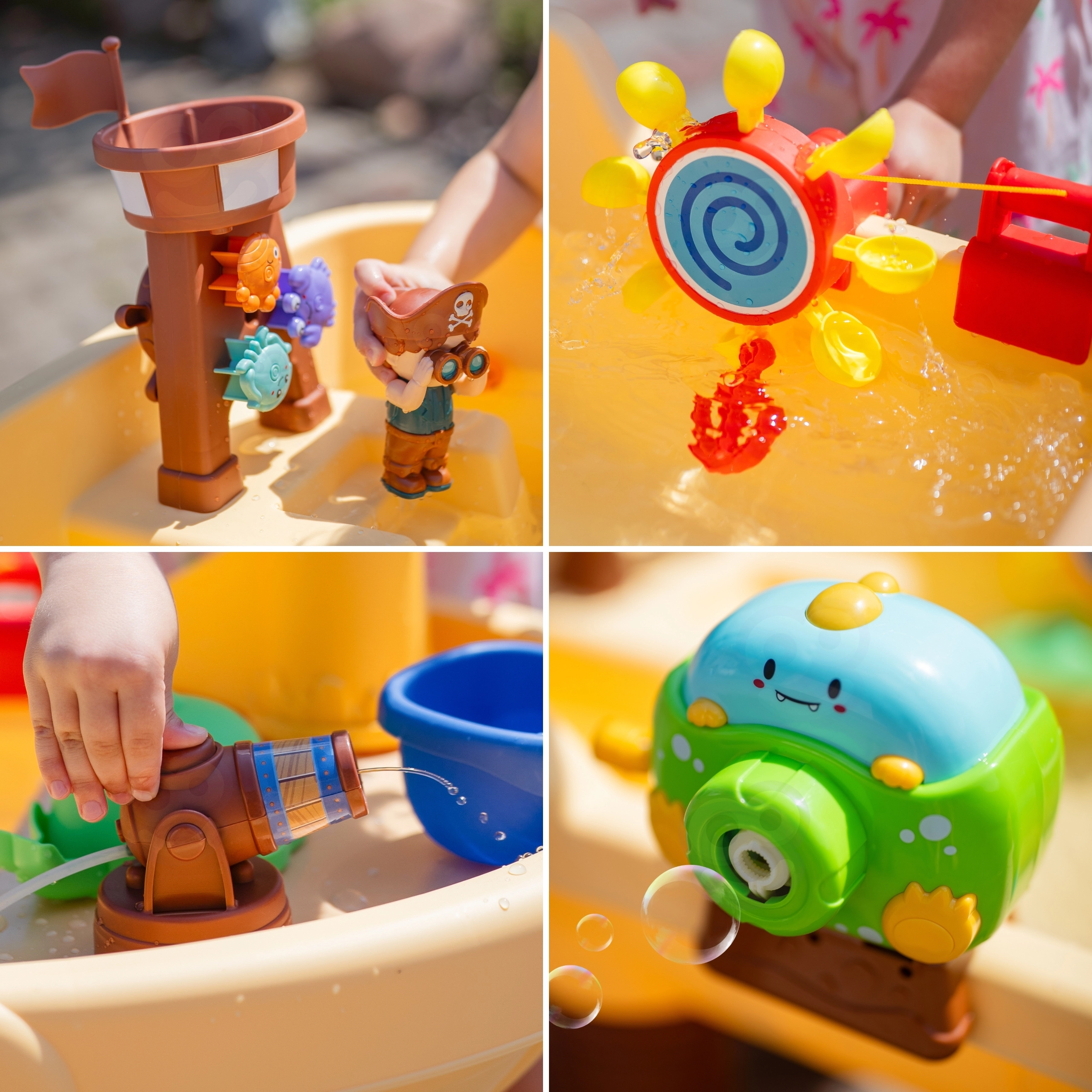 Η ενσωματωμένη μηχανή σαπουνόφουσκων και το υδάτινο κανόνι μετατρέπουν το παιχνίδι σε πειρατικό σόου. Τα παιδιά μπορούν να ραντίζουν, να φυσούν και να παρατηρούν τις φούσκες και το τρεχούμενο νερό.
