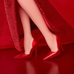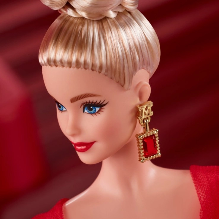 - Τα ρουμπινί κόκκινα ψηλοτάκουνα συμπληρώνουν την εντυπωσιακή της εμφάνιση και τα χρυσά σκουλαρίκια με το μοτίβο «M» παραπέμπουν στο παραδοσιακό λογότυπο της Mattel.