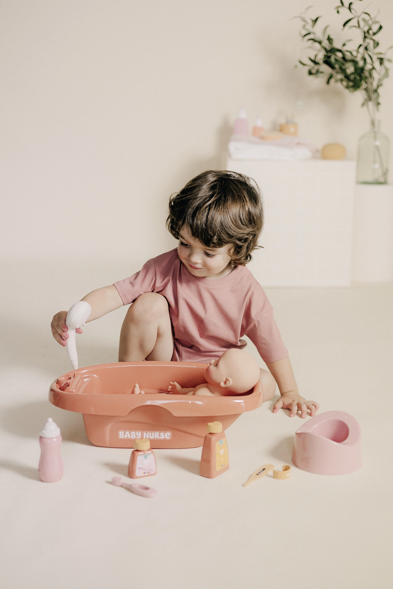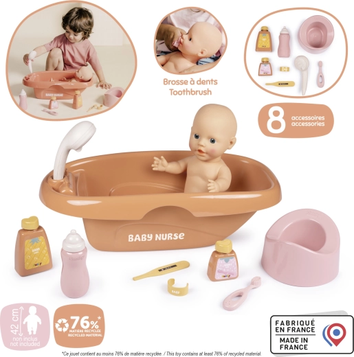Η μπανιέρα για κούκλες SMOBY BABY NURSE είναι ένα εξαιρετικό σετ για μικρούς φροντιστές. Προσφέρει ευρύχωρη μπανιέρα με ενσωματωμένη βρύση και αποσπώμενο χειροκίνητο ντους με μηχανική λειτουργία περιστροφής, ώστε το μπάνιο της κούκλας να φαίνεται πολύ ρεαλιστικό. Μετά το μπάνιο, τα παιδιά μπορούν να ταΐσουν την κούκλα με μπιμπερό και να φροντίσουν την καθημερινή της υγιεινή.