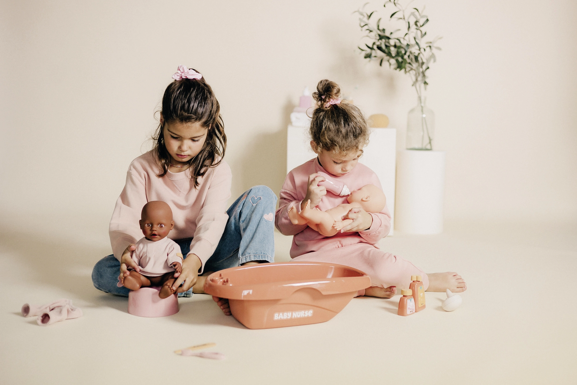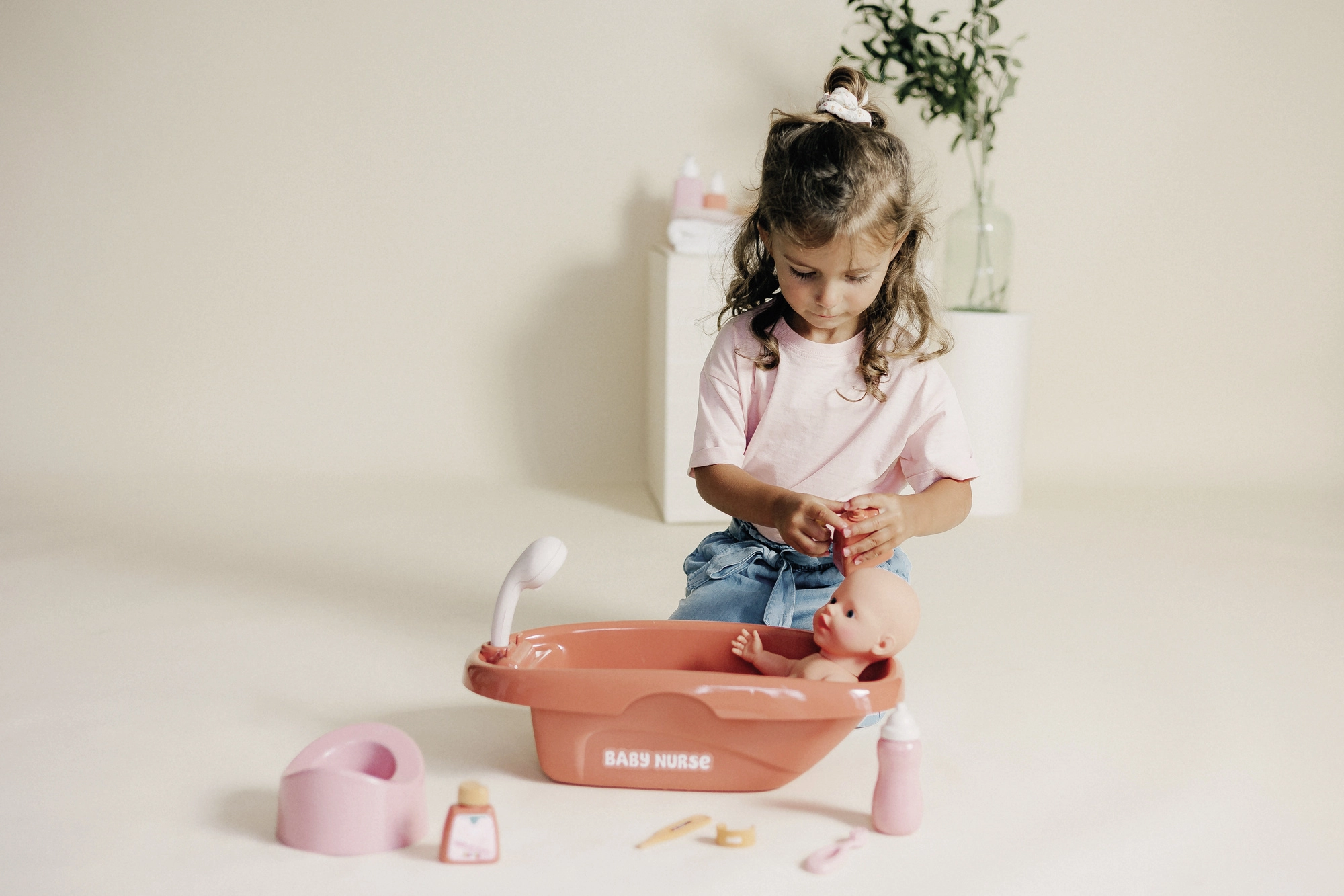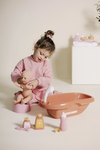 Μεγάλη μπανιέρα με βρύση και αποσπώμενο χειροκίνητο ντους με μηχανική περιστροφή, που επιτρέπει στα παιδιά να μιμηθούν το πραγματικό μπάνιο της κούκλας και να αναπτύξουν τη φαντασία τους.