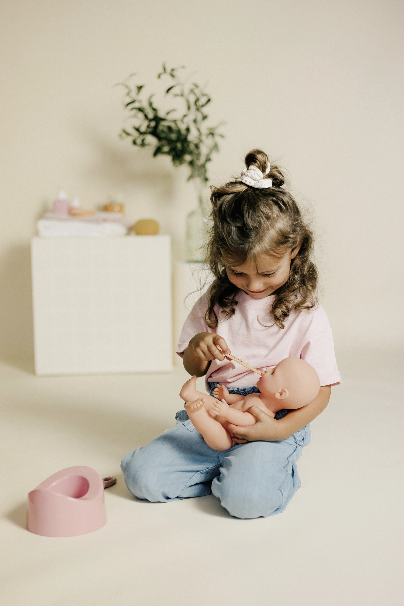 Περιλαμβάνεται μεγάλη ποικιλία αξεσουάρ: γιο-γιο, θερμόμετρο, οδοντόβουρτσα, μπουκαλάκια και άλλα αξεσουάρ που κρατιούνται εύκολα από τα παιδιά. Το σετ κατασκευάζεται στη Γαλλία και χρησιμοποιεί ανακυκλωμένα υλικά (76%), αποτελώντας μια οικολογική επιλογή. Κατάλληλο για κούκλες έως 42 εκ.