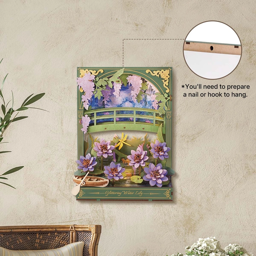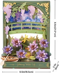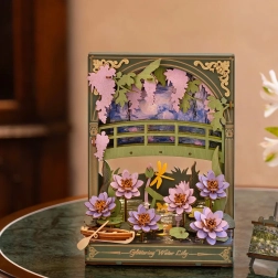 Βυθιστείτε στον κόσμο της τέχνης και της χαλάρωσης με το μοναδικό μας 3D μοντέλο Λαμπερών Νούφαρων, εμπνευσμένο από τα διάσημα έργα του Μονέ. Μετά τη συναρμολόγηση, το παζλ παρουσιάζει μια μαγευτική σκηνή με λεπτομερή λουλούδια, βαρκούλα και ξύλινη γέφυρα, που δημιουργούν ατμόσφαιρα γαλήνης και αρμονίας. Ο LED φωτισμός προσδίδει μια ακαταμάχητη μαγική αύρα, που θυμίζει το παιχνίδι του φωτός στο ηλιοβασίλεμα.