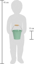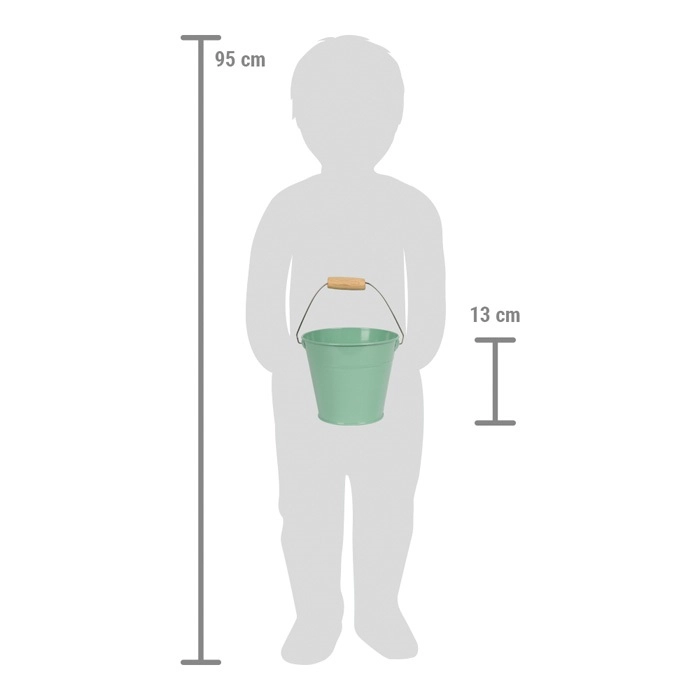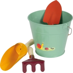 Τα εργαλεία περιλαμβάνουν δύο φτυαράκια και μία τσουγκράνα, ιδανικά για φύτευση, σκάψιμο ή χτίσιμο κάστρων στην άμμο. Ο μεταλλικός κουβάς είναι ιδανικός βοηθός για μεταφορά νερού, άμμου ή χώματος. Τα παιδιά μπορούν να μεταφέρουν εύκολα αυτό το σετ παντού – στον κήπο, στην παιδική αμμοδόχο και στην παραλία.