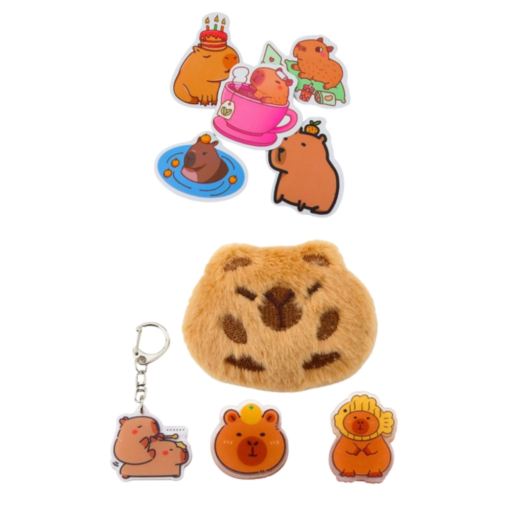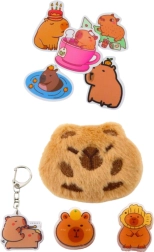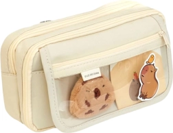 Η κασετίνα είναι κατασκευασμένη από ανθεκτικό υλικό που εξασφαλίζει μεγάλη διάρκεια ζωής. Η κομψή μπεζ απόχρωση της ταιριάζει σε διαφορετικά στυλ. Περιλαμβάνει επίσης μια λούτρινη καπίμπαρα που μπορείτε να κρεμάσετε στην κασετίνα, το σακίδιο ή τα ρούχα σας. Το σετ αξεσουάρ περιλαμβάνει επίσης μπρελόκ με θέμα καπίμπαρα, δύο κλιπ και πέντε αυτοκόλλητα καπίμπαρα.