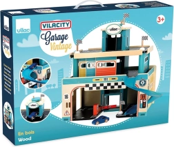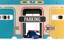 Το ξύλινο γκαράζ σε vintage στιλ από τη σειρά Vilacity προσφέρει στα παιδιά ατελείωτες δυνατότητες παιχνιδιού. Χάρη στις συρόμενες πόρτες, τον ανελκυστήρα για αυτοκινητάκια και τη σπειροειδή πίστα, τα παιδιά μπορούν να: