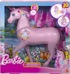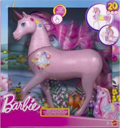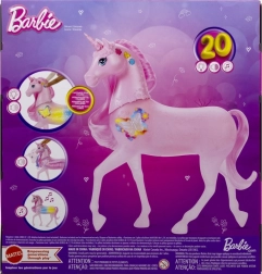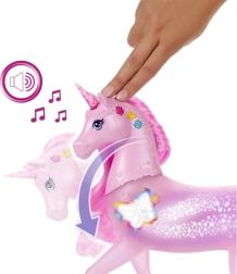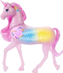 Ο μαγικός μονόκερος Barbie μετατρέπει κάθε παιχνίδι σε μια πολύχρωμη παράσταση γεμάτη φώτα, ήχους και μουσική. Με ένα απαλό χάδι στο κεφάλι ξεκινάτε το σόου και με τη βοήθεια των τριών χρωματιστών κουμπιών δημιουργείτε έως και 20 μοναδικούς συνδυασμούς – από απαλές λάμψεις μέχρι εντυπωσιακές φωτεινές χορογραφίες.