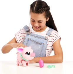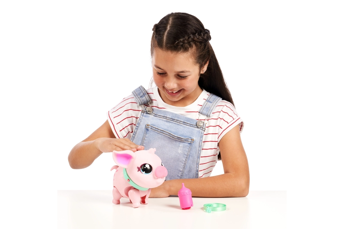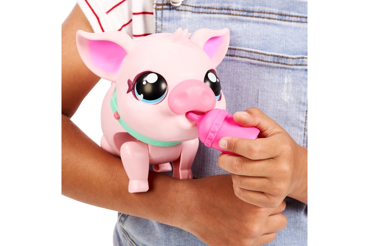 Περιλαμβάνεται ροζ μπιμπερό. Τάισε το γουρουνάκι σου, χάιδεψέ το και δες τις αντιδράσεις του – φροντίδα κατοικιδίου σαν αληθινή.