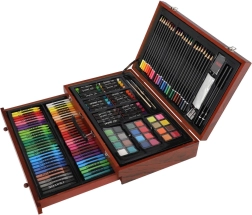 Πολυχρηστικό δημιουργικό σετ για μικρούς και μεγαλύτερους καλλιτέχνες, που περιλαμβάνει συνολικά 143 τεμάχια για ζωγραφική, σκίτσο και χειροτεχνίες. Όλα είναι τακτοποιημένα σε μία κομψή ξύλινη βαλίτσα με κλείσιμο, διαστάσεων 38 × 25 × 8 cm. Ιδανικό για δημιουργίες στο σπίτι, σχολικά πρότζεκτ και ταξίδια. Κατάλληλο για παιδιά από 14 ετών.