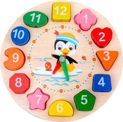 Το ρολόι διαθέτει δύο κινούμενους δείκτες και λεπτοδείκτες με αριθμήσεις, που διδάσκουν τα παιδιά στις ακέραιες ώρες και βελτιώνουν την ικανότητά τους να εργάζονται με τον χρόνο. Στο καντράν υπάρχει ένας χαρούμενος πιγκουίνος που τραβά την προσοχή ακόμη και των μικρότερων.