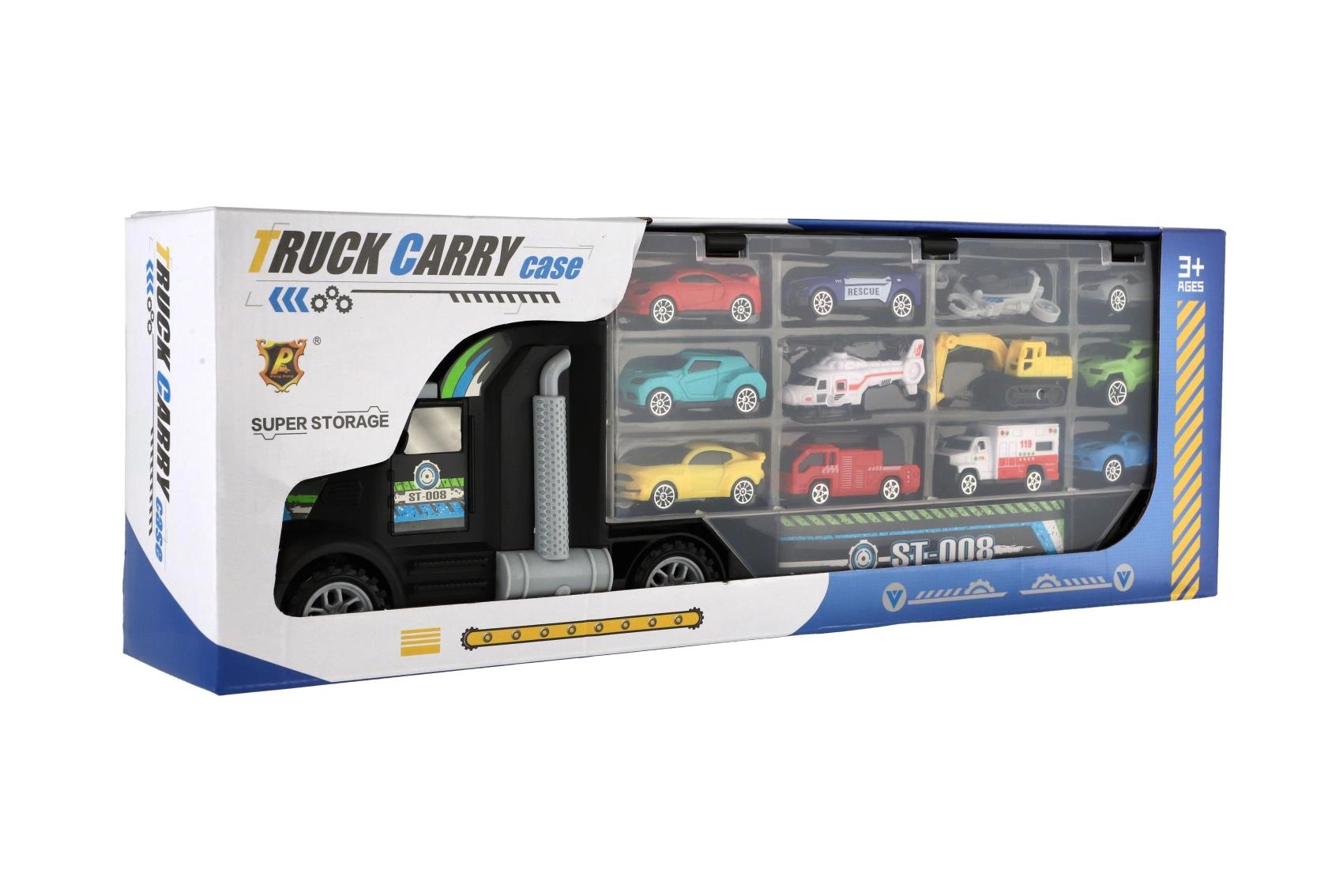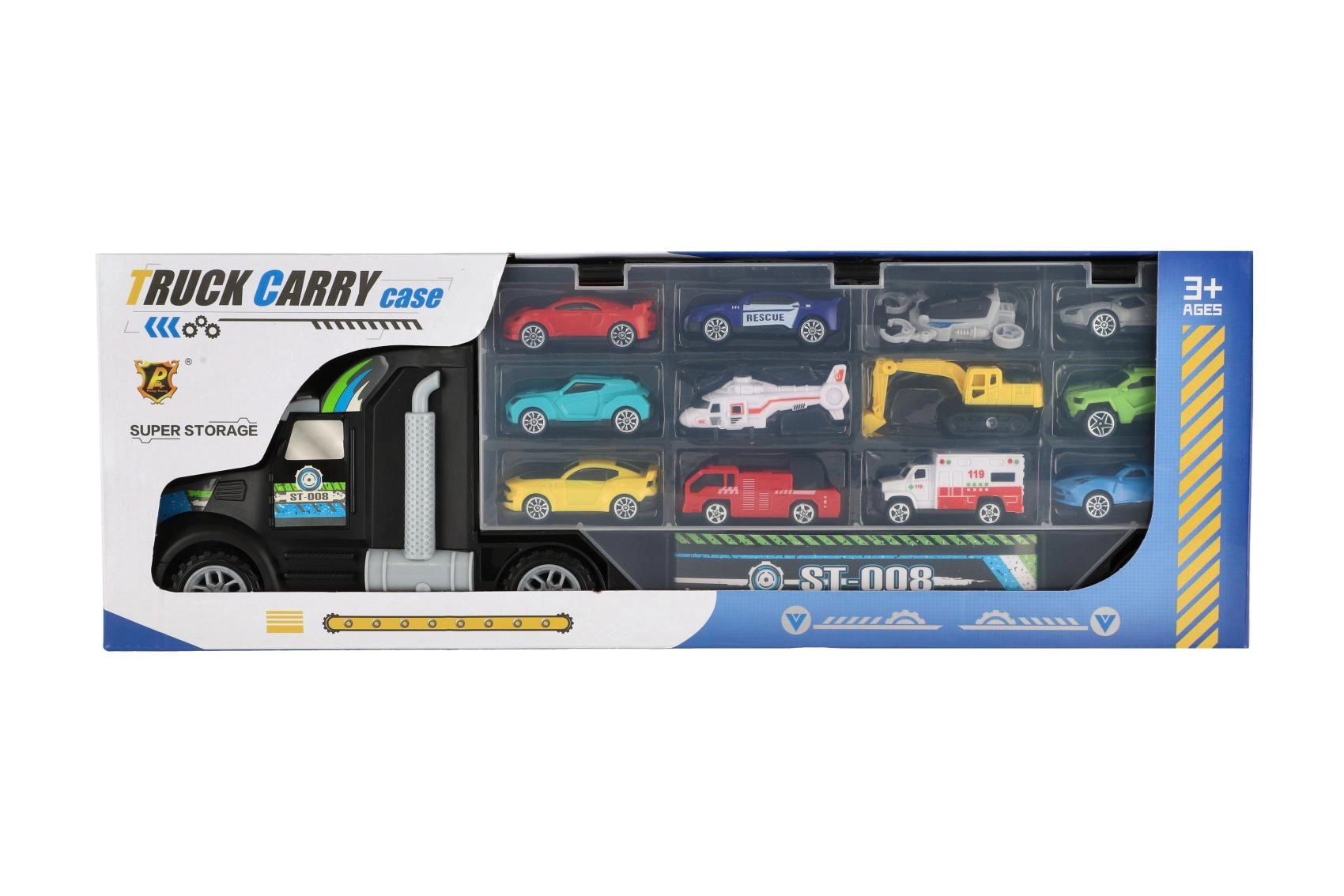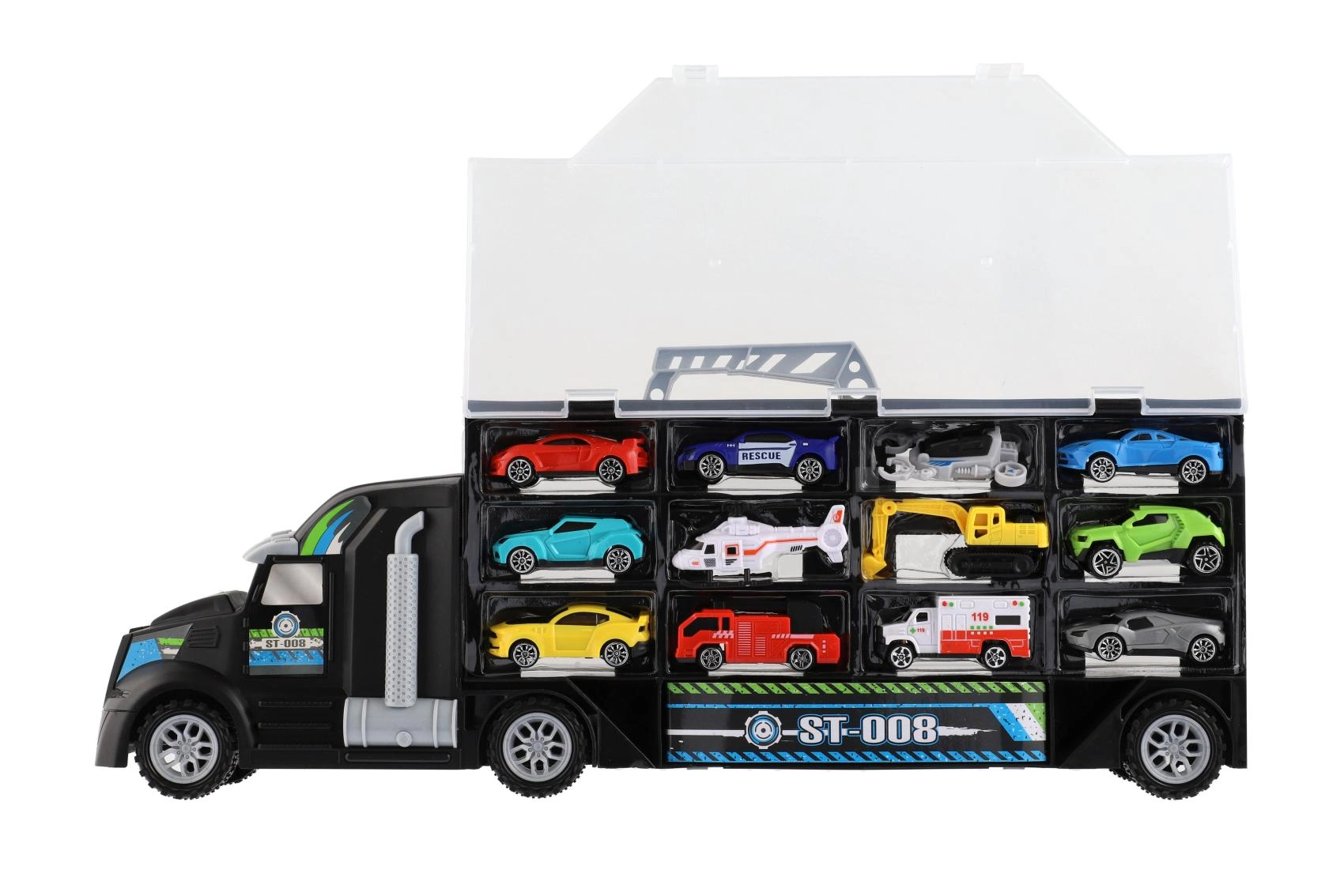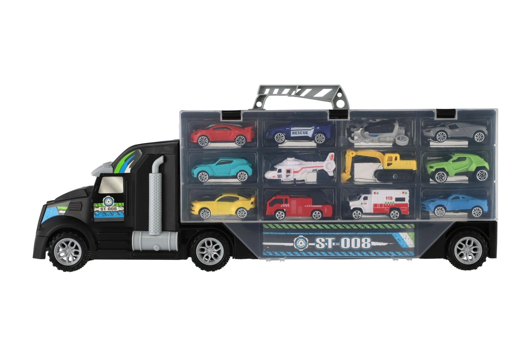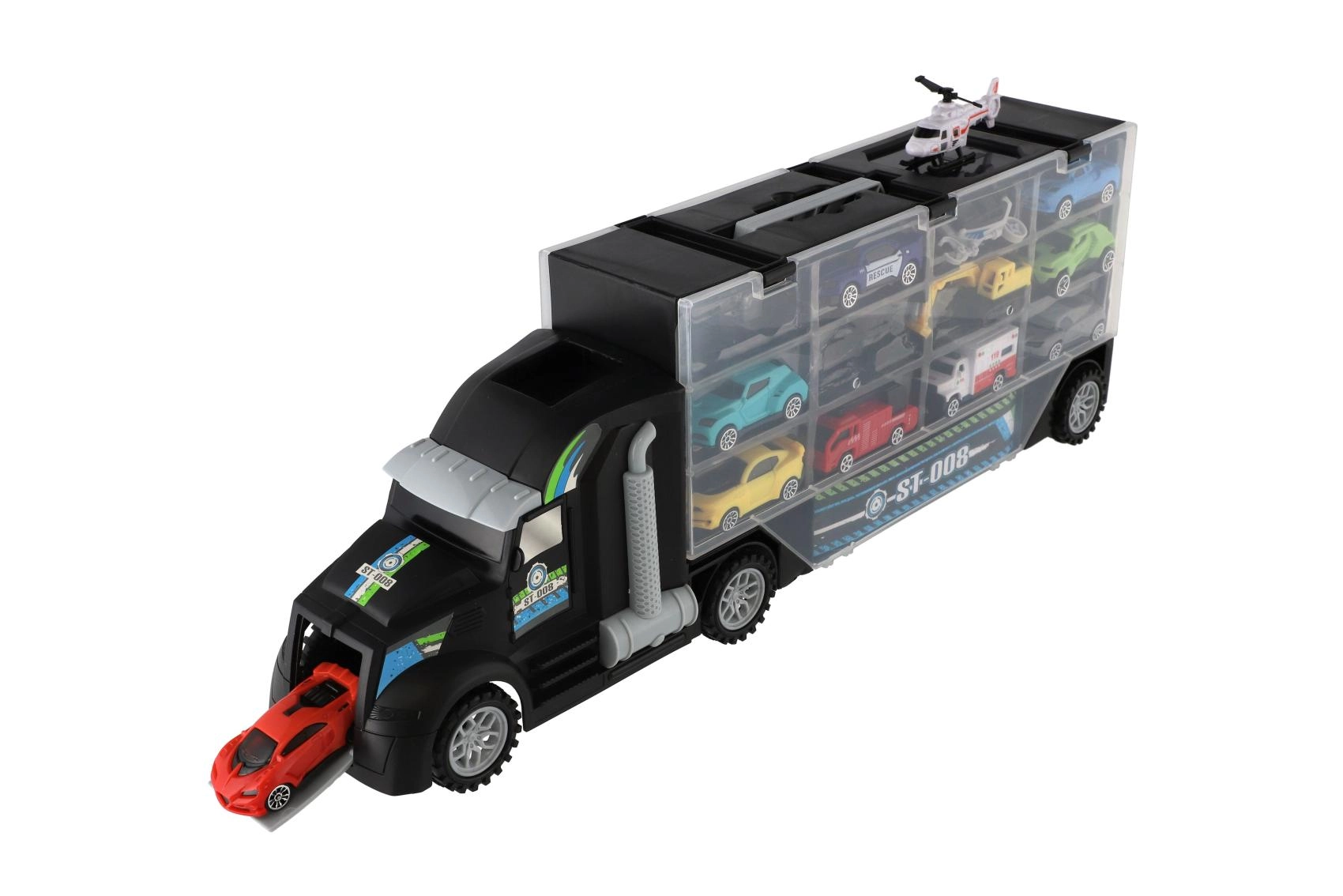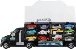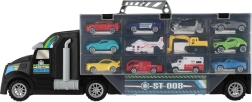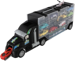Μεγάλο φορτηγό-μεταφορέας με ελεύθερη κίνηση, ιδανικό δώρο για μικρούς λάτρεις των αυτοκινήτων. Αυτό το πολυλειτουργικό φορτηγό λειτουργεί ως κουτί αποθήκευσης και σετ παιχνιδιού, που επιτρέπει την εύκολη μεταφορά και έκθεση των οχημάτων.